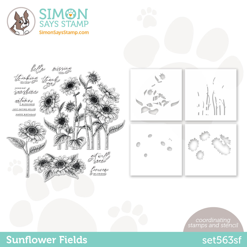 Simon Says Stamp clear stamps are high quality photopolymer and made in the USA. This stamp and stencil set includes the 6 x 8 inch stamp set Sunflower Fields, and the Sunflower Fields coordinating stencil set (ssst221651c).