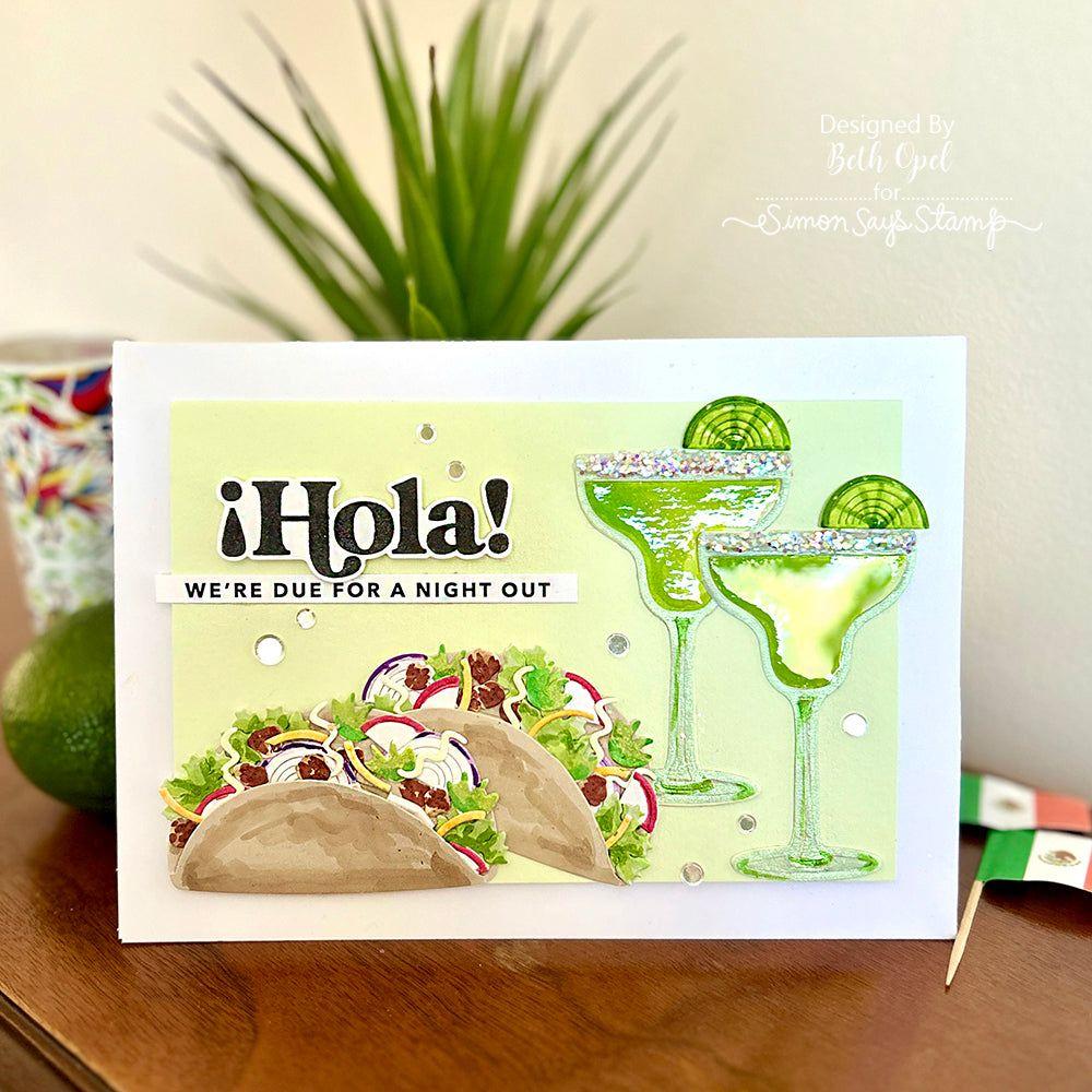 The whimsical stamp images and coordinating dies include tacos, margarita glasses, hot peppers, chips and dip, and more. The Build a Taco and Margarita glass dies give you larger options, and the sentiment strips are just right for bringing on the party!