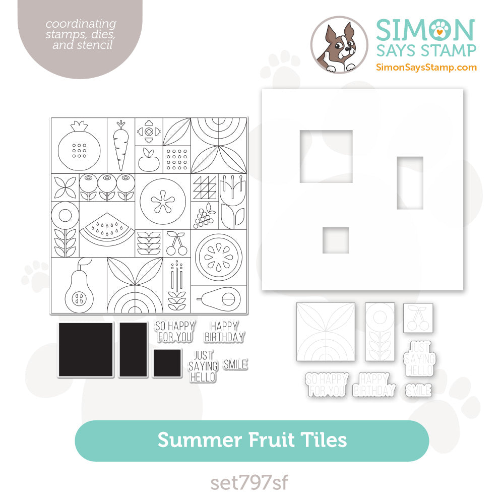 Introducing the Simon Says Stamp Summer Fruit Tiles stamp, stencil, and dies set! Delight in a vibrant array of modern, stylized fruit, vegetable, and floral images, arranged in a large grid for easy crafting.