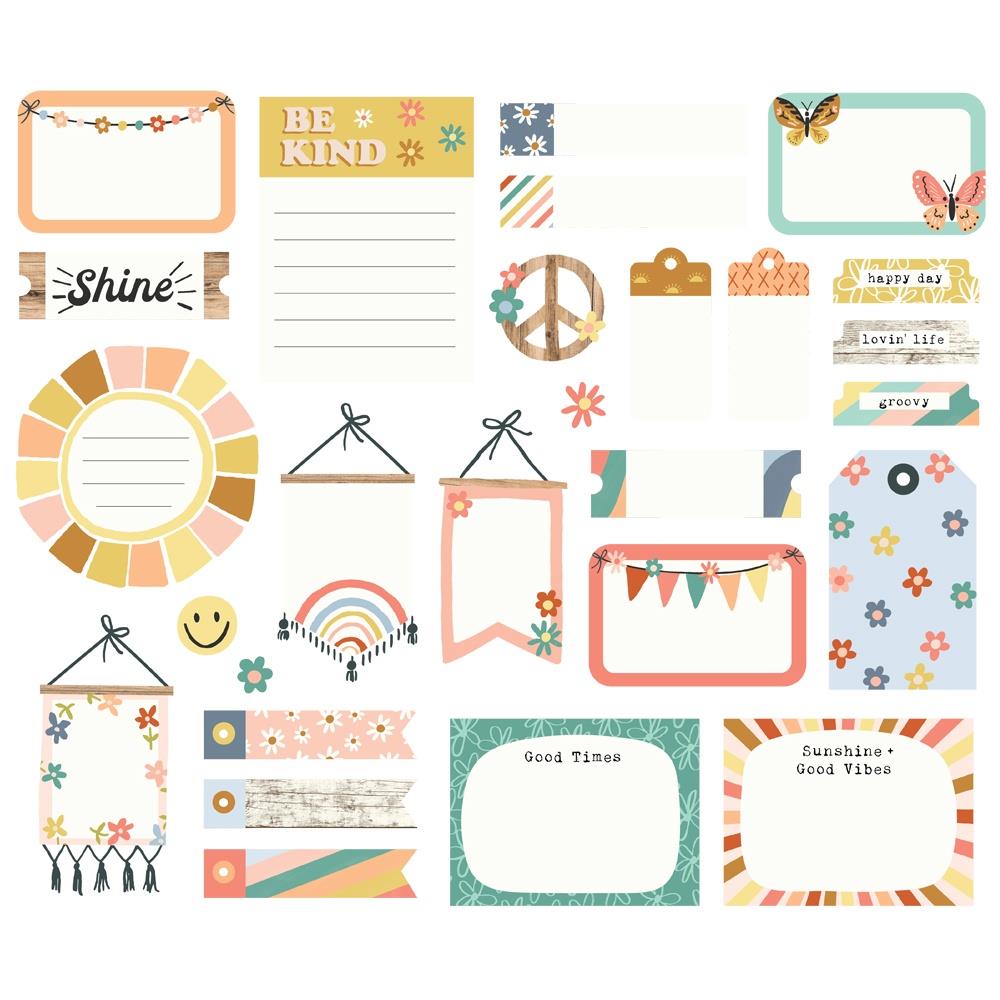 Introducing the Simple Stories Boho Sunshine Journal Bits And Pieces! This delightful pack is a must-have for any creative enthusiast looking to add a touch of whimsy and charm to their journals, scrapbooks, or other craft projects.