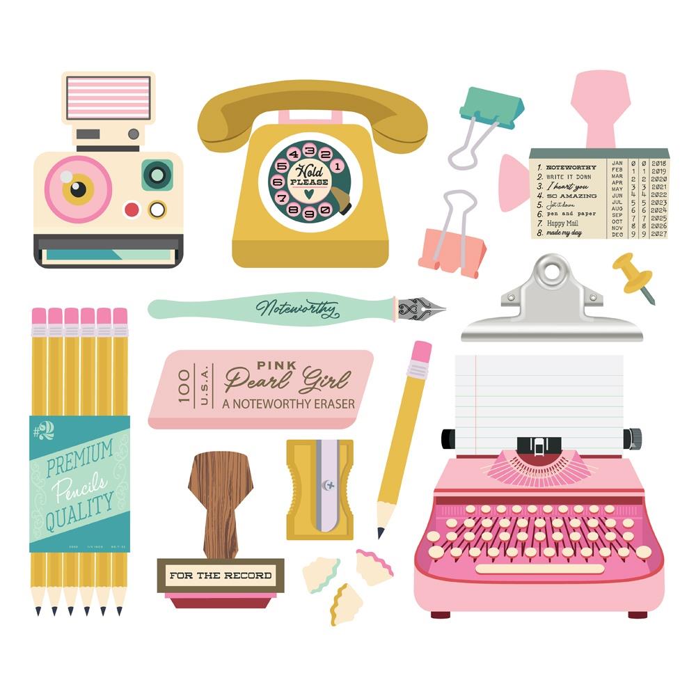 Embellish projects with Simple Stories Noteworthy Big Bits And Pieces. This package contains 17 extra-large die-cut cardstock pieces, featuring imagery like a polaroid camera, rotary telephone, binder clips, pushpins and more. Perfect for scrapbook pages, greeting cards and more! Pack is approximately 6 x 7.2 inches.