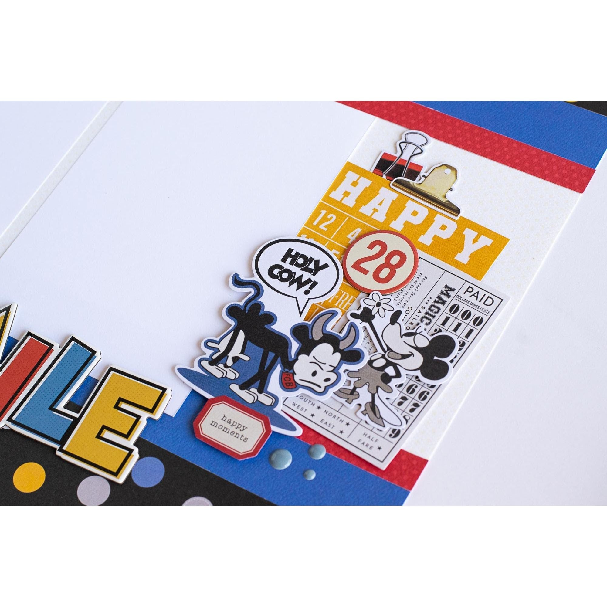 Enhance your scrapbook pages, greeting cards, and other paper crafting projects with die-cut embellishments! This 5.1 x 5.9 inch package includes 28 cardstock pieces featuring beloved characters like Mickey and Minnie Mouse, along with anchors, dots, stars, musical notes, hearts, and ship helms in a variety of colors. Perfect for adding a touch of nostalgia to your creations.