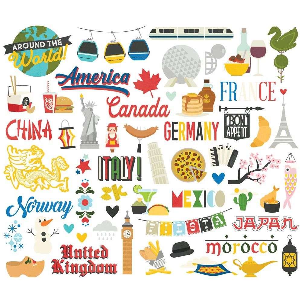 This pack includes 57 pieces of die cut cardstock, each measuring 4.8 x 5.6 inches. Imagery includes: skyline ride, monorail, world, Epcot ball, Mickey Mouse ears, food, landmarks, and icons from around the world.