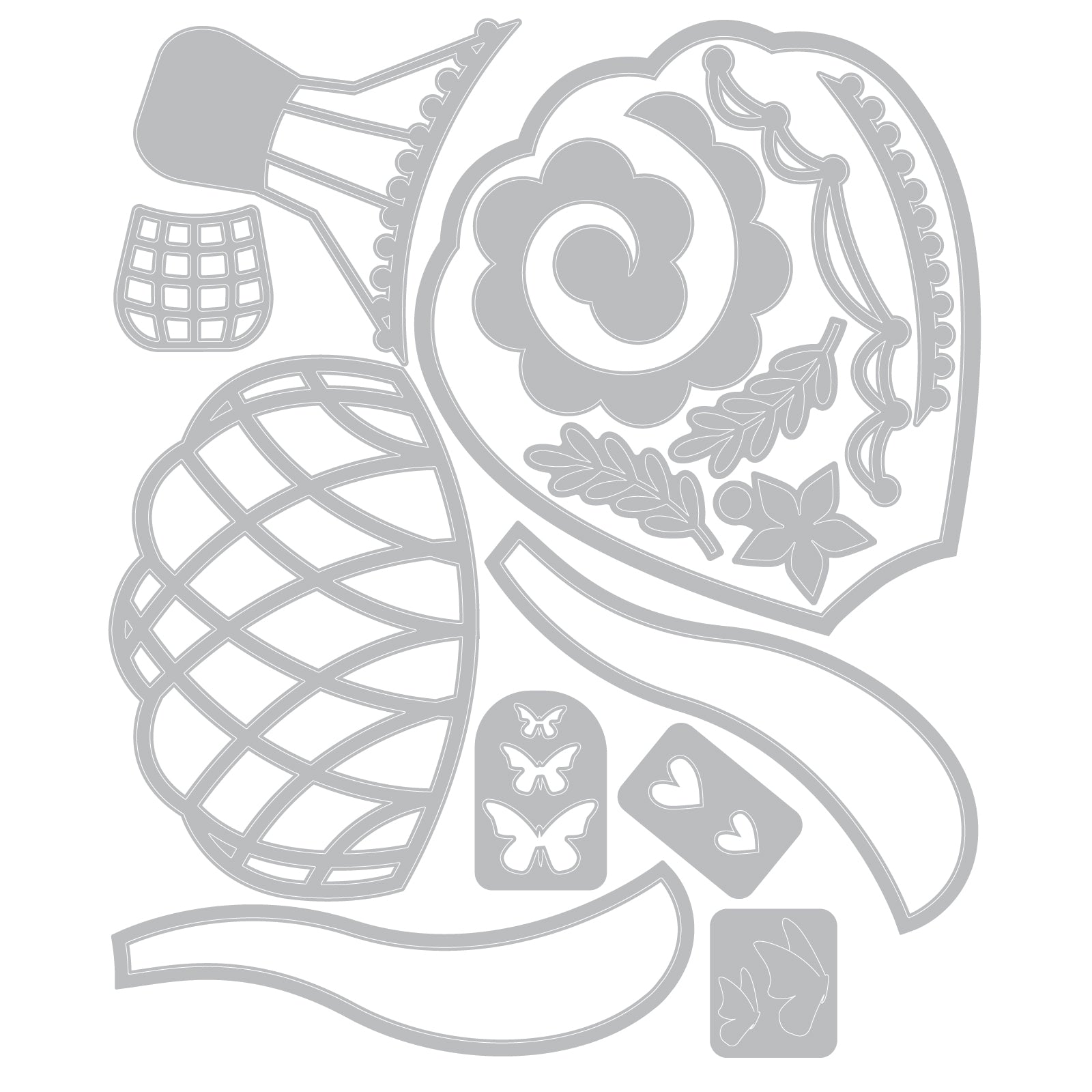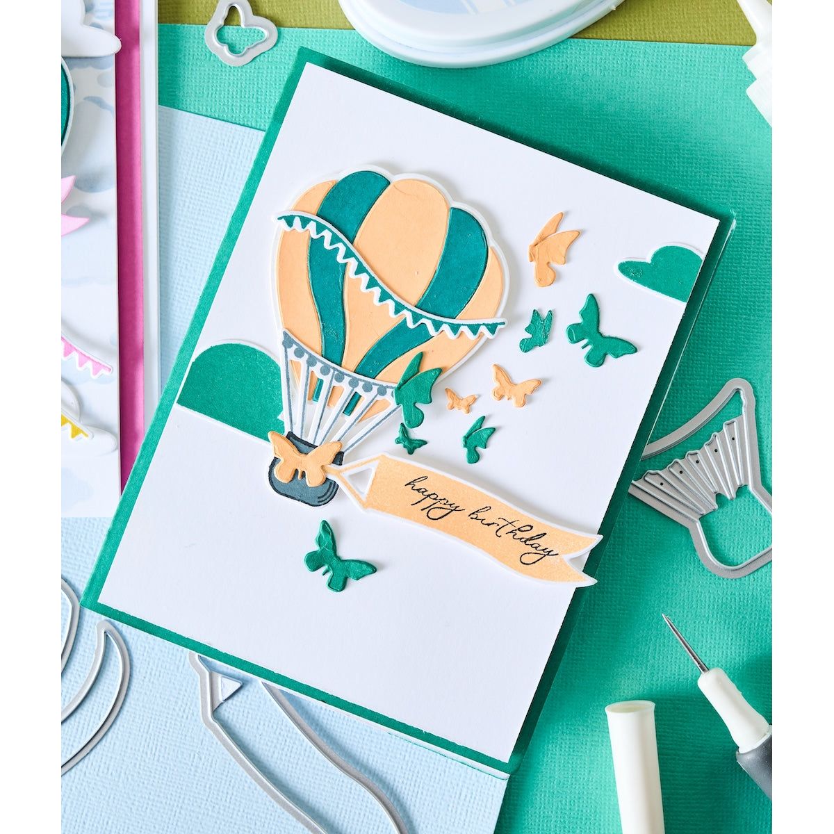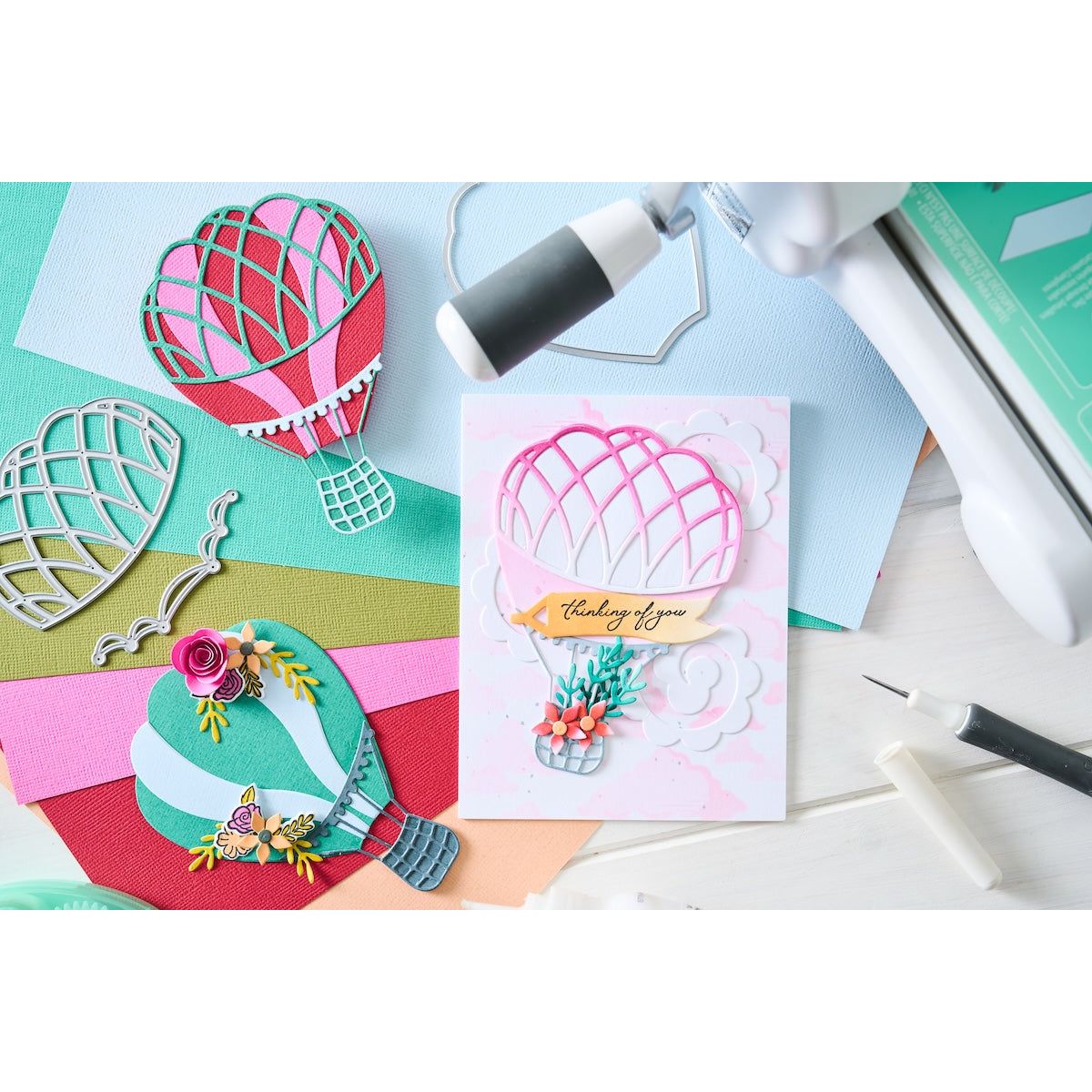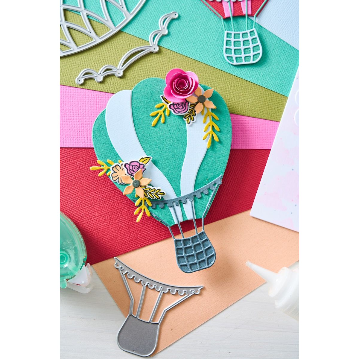 Sizzix Floating Fancy Thinlits Dies, designed by Catherine Pooler, feature intricate hot air balloon elements, making them perfect for crafting everything from cards and scrapbook layouts to unique home décor pieces. This wafer-thin die set includes 15 pieces, ranging in size from approximately 3.375 x 3.625 inches to 1.125 x 1.125 inches. The designs allow you to customize a hot air balloon with stripes, ornate netting, and decorative bunting, along with charming accents like florals, hearts, butterflies, and birds. For even more creative possibilities, pair these dies with the In the Clouds Layered Stencils 666835 to create stunning backgrounds. Add texture and dimension by embossing each balloon segment with the Posh Patterns Embossing Folder. Let your imagination soar with this beautifully detailed set!