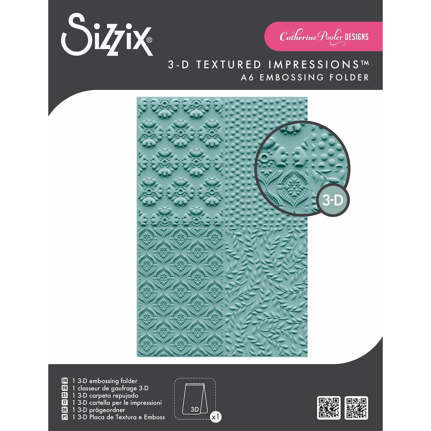Sizzix Posh Patterns 3-D Textured Impressions Embossing Folder, designed by Catherine Pooler, features four distinct patterns, each crafted to add intricate texture and dimension to your creative projects. The designs range in size from approximately 4.5 x 6 inches to 0.5 x 0.25 inches, offering a variety of decorative possibilities. This embossing folder includes elegant floral patterns, playful polka dots, delicate foliage, and graceful flourishes, making it perfect for adding depth to cards, scrapbook layouts, gift tags, and mixed media projects. The high-quality 3D design ensures crisp, detailed impressions for stunning results every time.