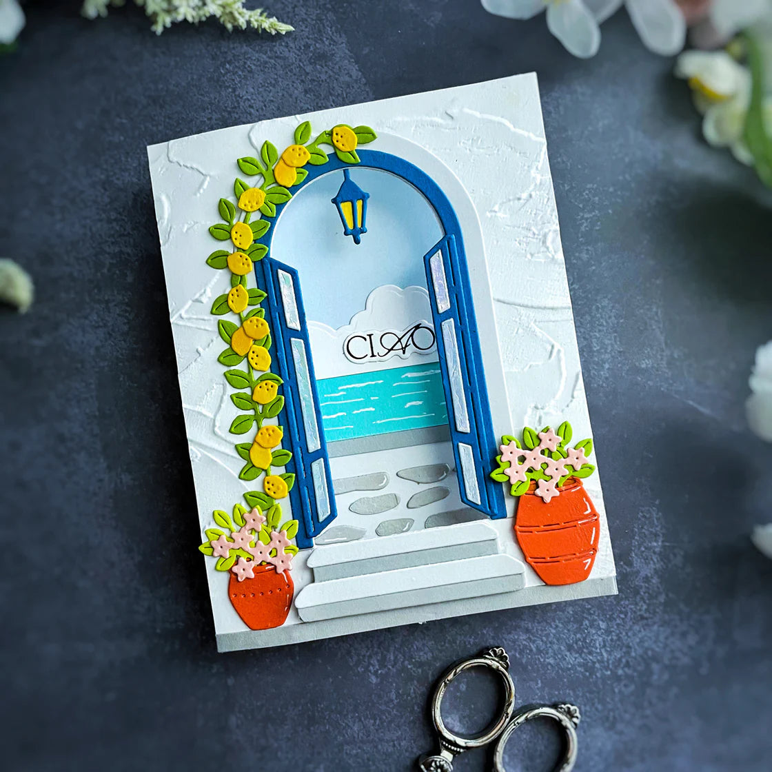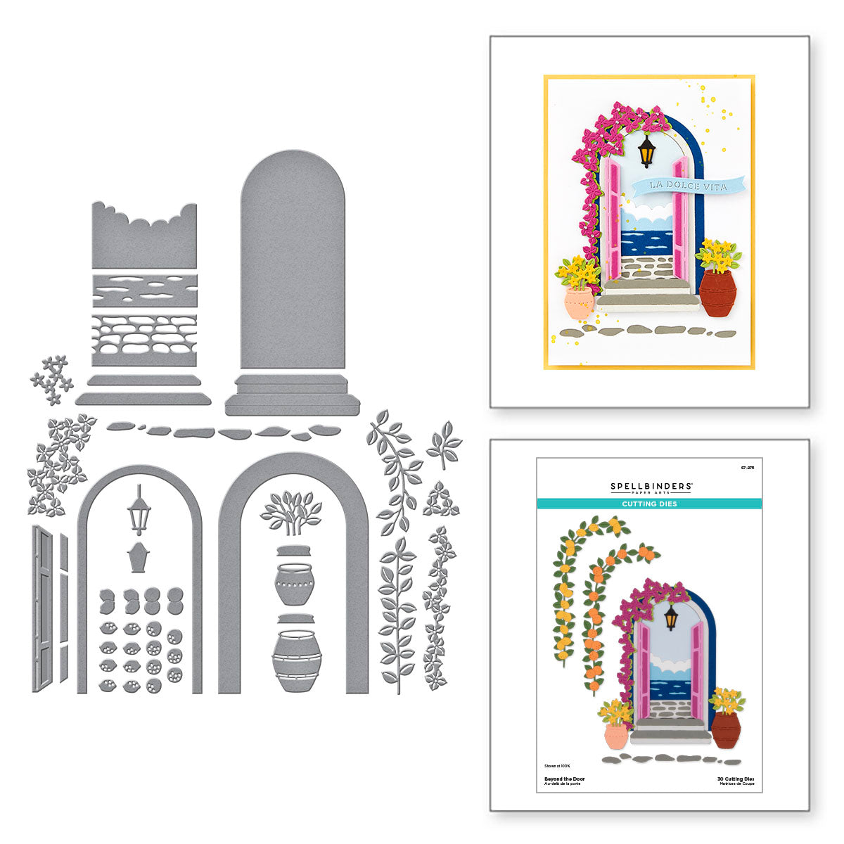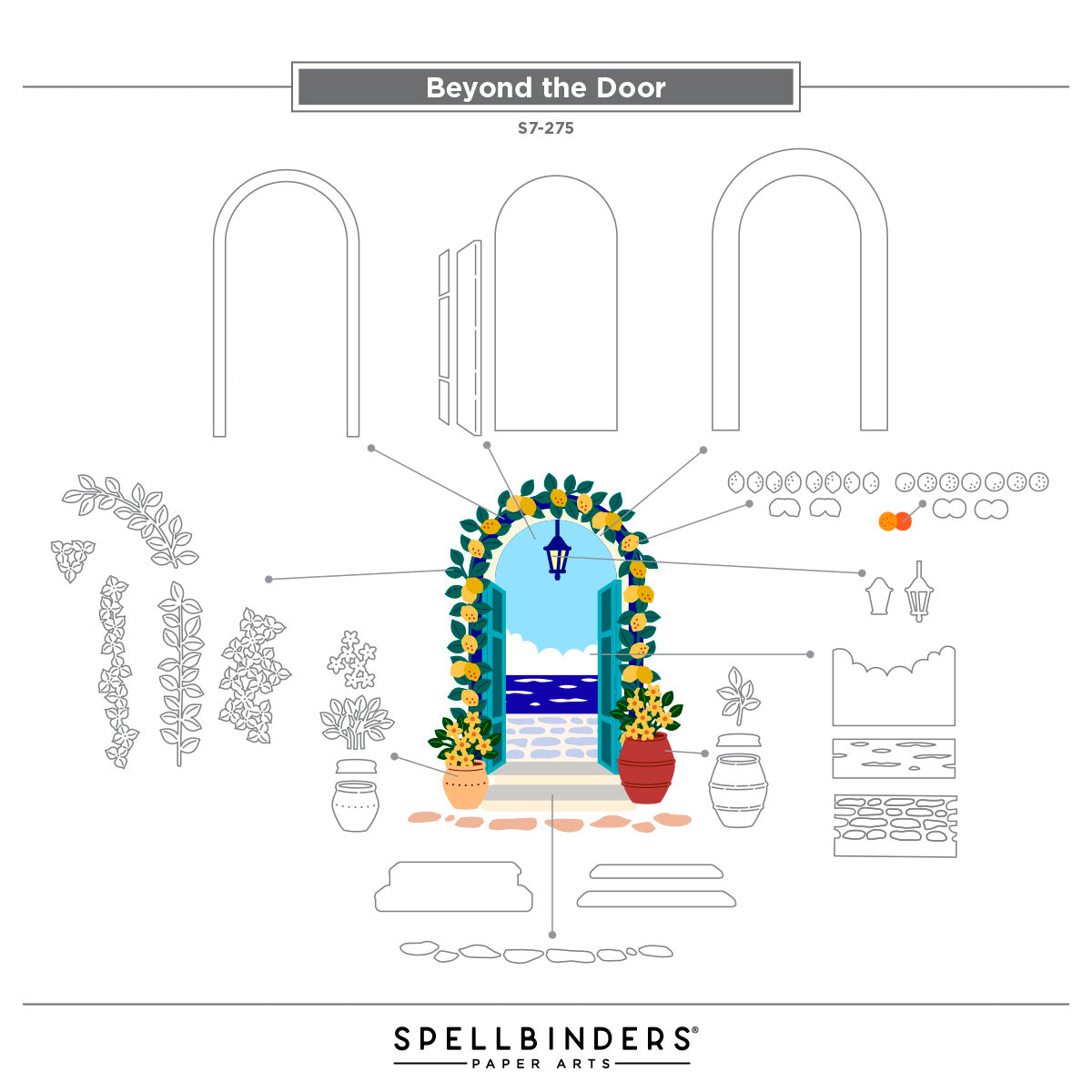 Spellbinders Beyond the Door Etched Dies are part of the La Dolce Vita Collection and offer a beautifully detailed way to craft scenic entryways with charm and imagination. This expansive set includes 29 thin metal cutting dies designed to create a variety of views through an arched door or window. From cobblestone paths and hanging lanterns to fruit trees, vines, potted flowers, and serene skies, the set is filled with elements to build layered, picturesque scenes. The versatile door can be styled as an entryway, transformed into a window with shutters, or customized with a deeper frame for added dimension. Perfect for storytelling in cards, journals, or mixed-media art, this set lets you create tranquil Mediterranean moments and dreamlike views—right beyond the door.