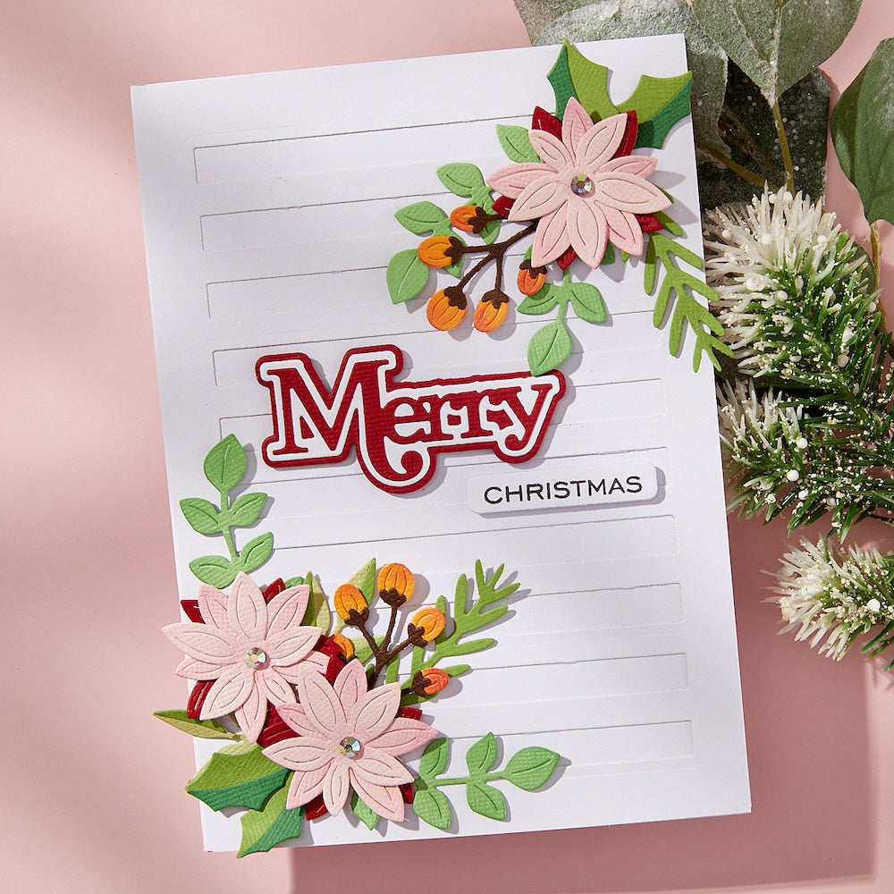 Spellbinders Christmas Foliage Etched Dies, part of the All About Christmas Collection by Lisa Horton, includes 12 thin metal dies featuring foliage, holly, berries, buds, and a poinsettia. Use the pieces to build festive greenery clusters, create garlands, accent edges, and more.