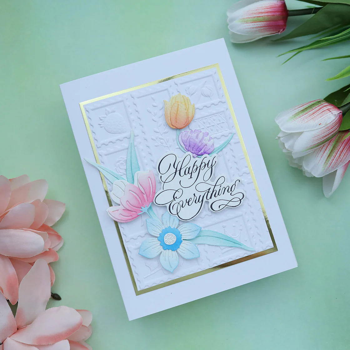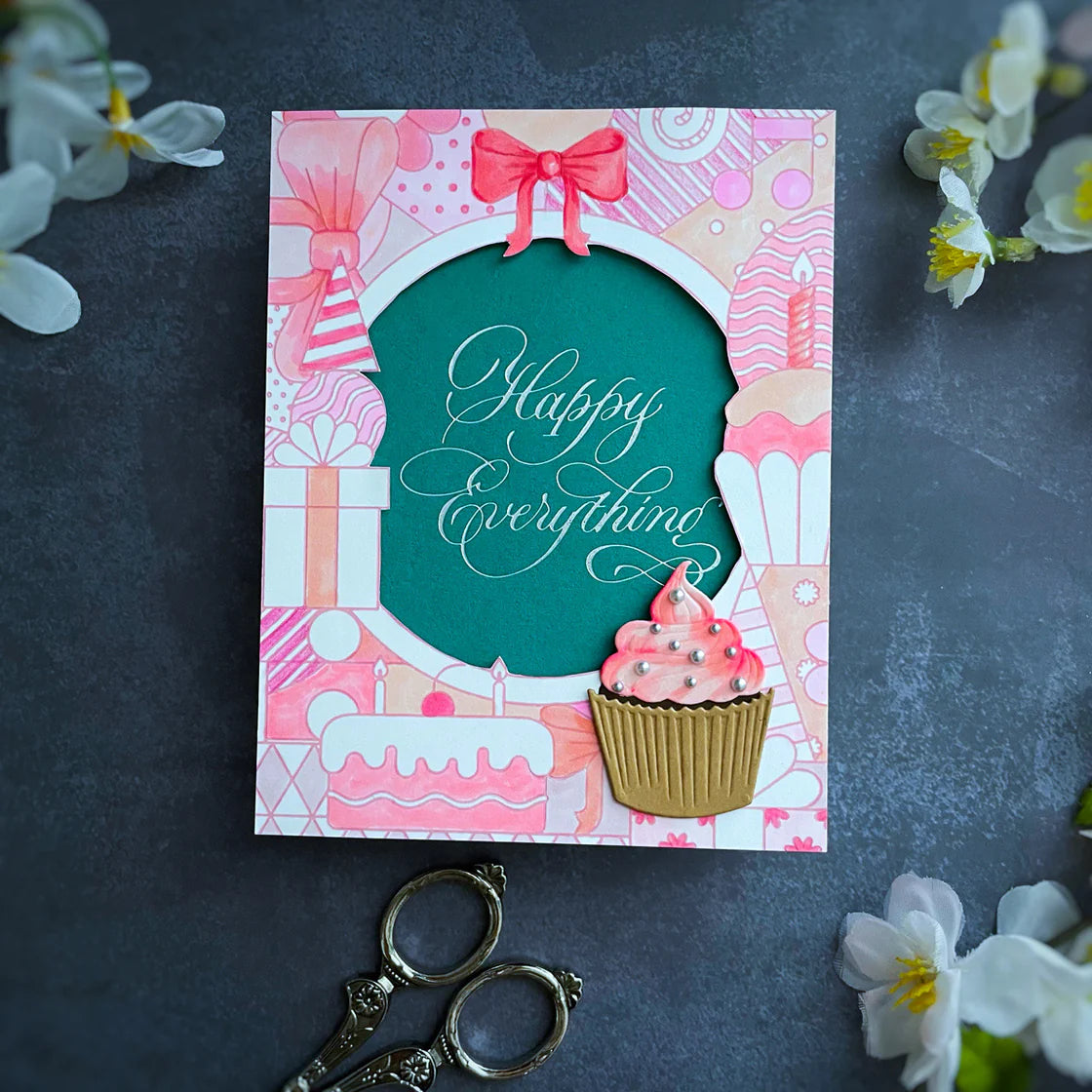 The Spellbinders Copperplate Happy Birthday and Everything BetterPress Plate & Die Set is part of the Copperplate Happy Everything Sentiments Collection by Paul Antonio. This set includes two BetterPress plates that impress the sentiments "Happy Birthday" and "Happy Everything," each with its own coordinating thin metal cutting die. Use the dies to cut around the sentiments for added dimension or to layer with different papers. Ink the plates with BetterPress Ink to be pressed against the BetterPress Cotton Card Panel and Sheets for a crisp letterpress design. Only four easy steps for professional results! Place the BetterPress Press Plate onto the Chase (magnetic platform to hold the press plate). Next, tape the Card Panel on the Platen (clear top plate with registration marks). Apply Ink onto the Press Plate. Make a Letterpress Sandwich and run it through a manual die-cutting machine. It’s an easy-to-use system that produces a professional stationery style with detailed impressions that can be felt to the touch. For added creativity, pair it with the Glimmer Hot Foil System to create unique cards, stationery, and paper crafts with beautiful, touchable detail.