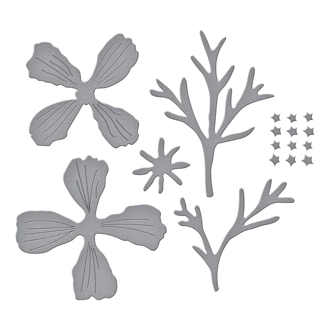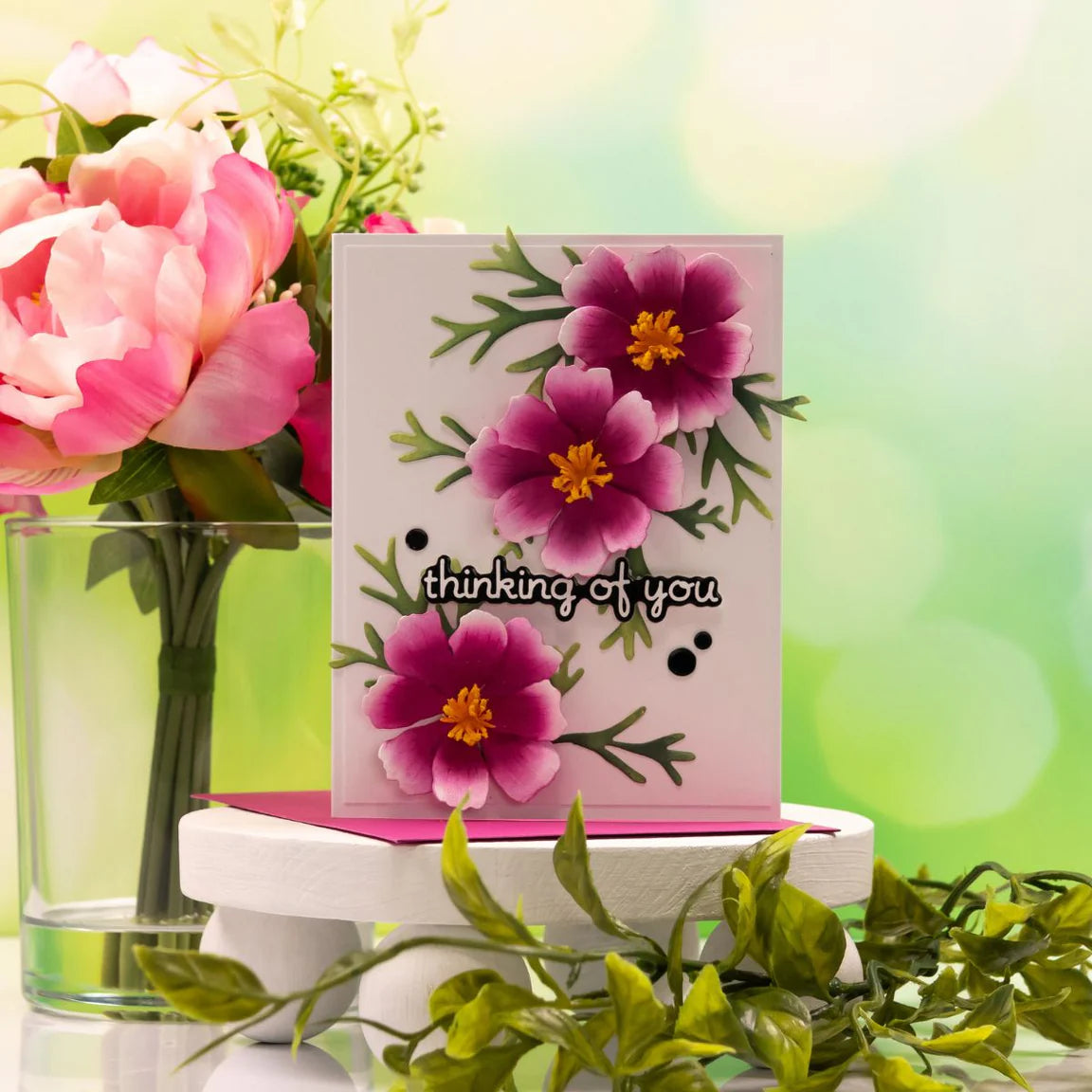 Cosmos Etched Dies are from the Summer Solstice Garden Collection by Susan Tierney-Cockburn. Assembled, this set of six thin metal cutting dies makes an adorable Cosmos flower. The finished flower with foliage measures approximately 2.75 x 2.50 x 0.75 inches / 7.00 x 6.40 x 1.90 cm.