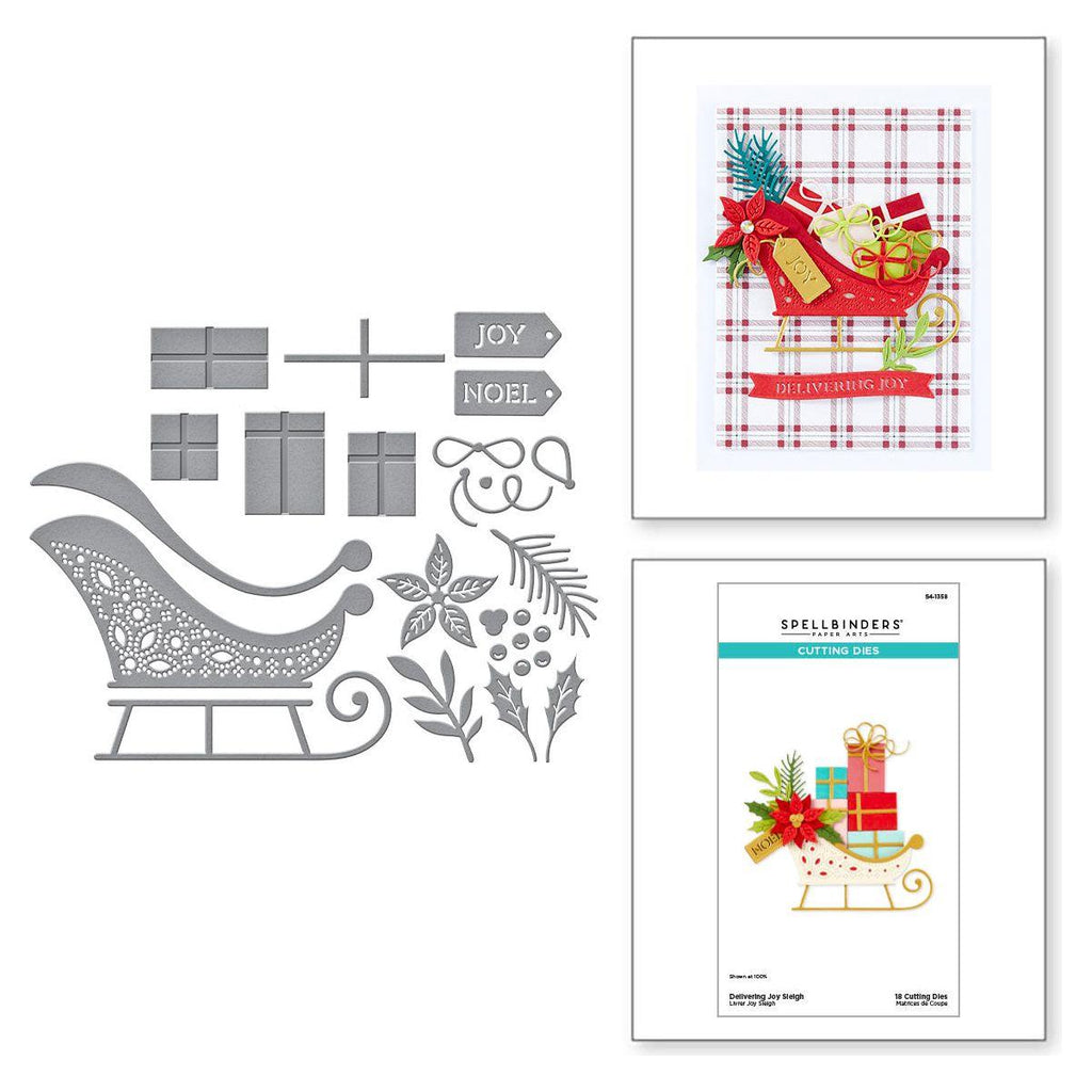 The Spellbinders Delivering Joy Sleigh Etched Dies are part of the Handmade Holidays Collection. When assembled, this set of 18 thin metal cutting dies creates a stunning sleigh full of gifts! The set includes numerous details such as gift-wrapped presents with bows, greenery, gift tags, poinsettias, and more, making it perfect for adding intricate and festive touches to your holiday projects.