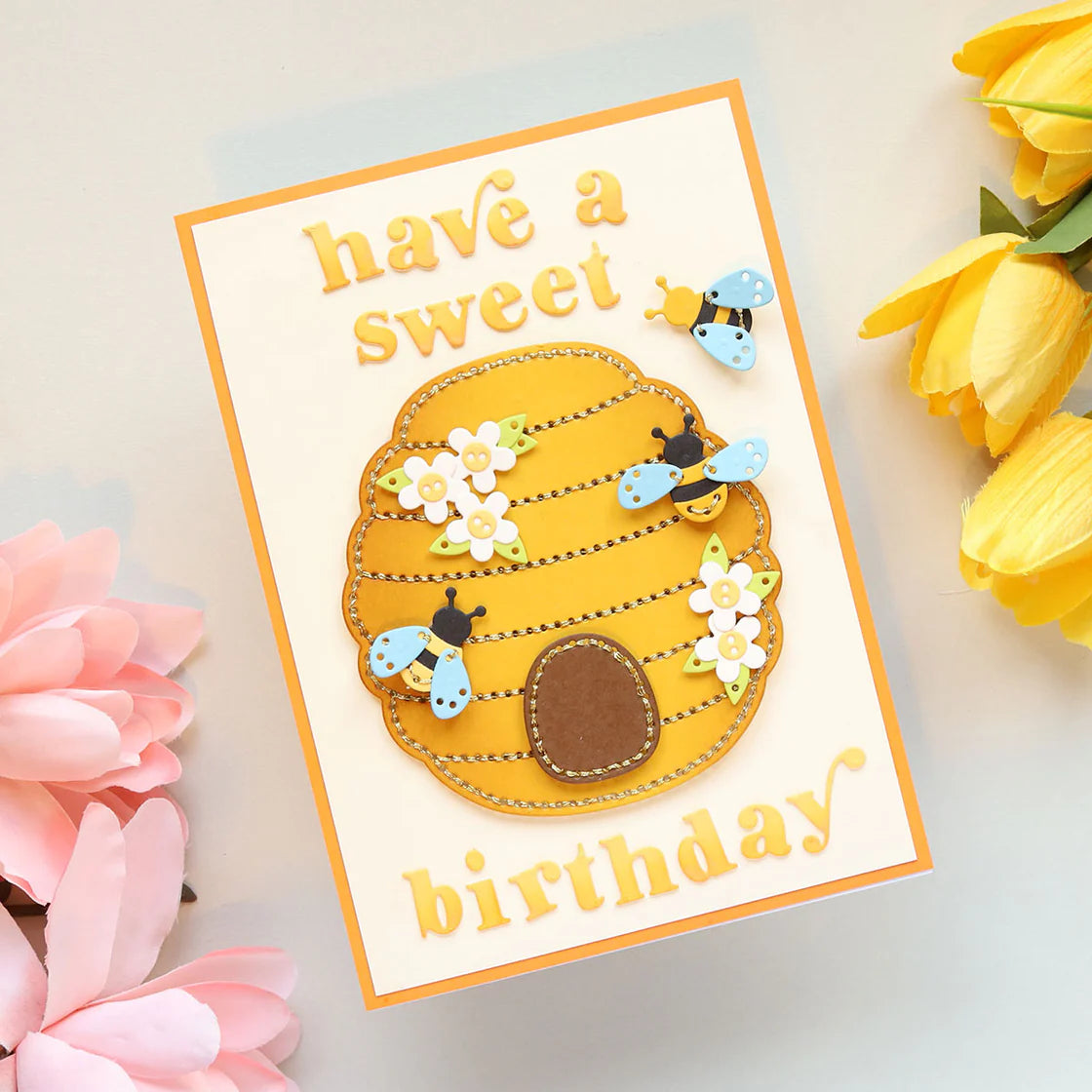 Spellbinders Felt Floral Beehive Etched Dies are part of the Summer Felt Stitch & Create Collection by Nichol Spohr. Make an adorable beehive accented with cute bumblebees and floral designs using this set of 14 thin metal cutting dies. The detailed stitching on the shapes’ edges gives it a finished look and becomes a stitching guide. Cut with Merino Wool Felt Sheets (sold separately) for texture or cut in paper for a different look. The finished Bee measures approximately 1.14 x 0.94 inches / 2.90 x 2.40 cm, the Beehive measures 3.75 x 4.03 inches / 9.50 x 10.20 cm, and the vine measurements range from 1.01 x 1.26 inches / 2.60 x 3.20 cm to 0.89 x 1.09 inches / 2.30 x 2.80 cm. These felty designs are ideal for home décor, plushies, dimensional cards and more!