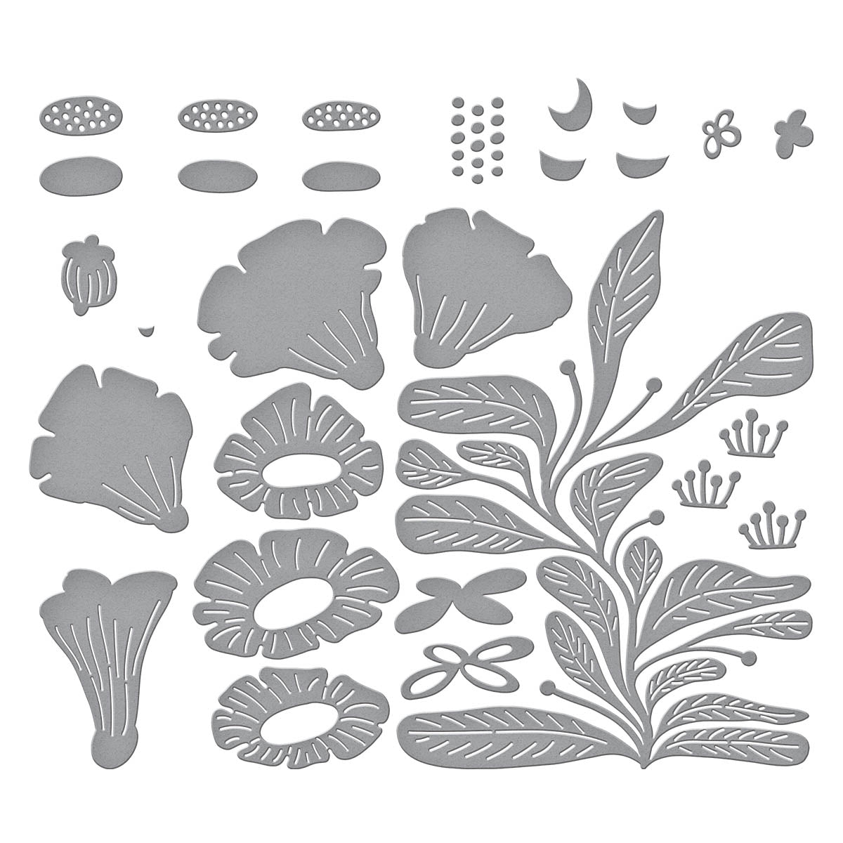 Spellbinders' Fresh Picked Angel Trumpets Etched Dies, part of the More Fresh Picked Collection, are a set of 13 thin metal cutting dies designed to create delightful Angel Trumpet blooms. These dies are intricately detailed, featuring leaf veins and flower centers for a realistic look.