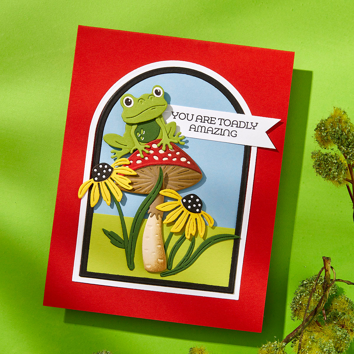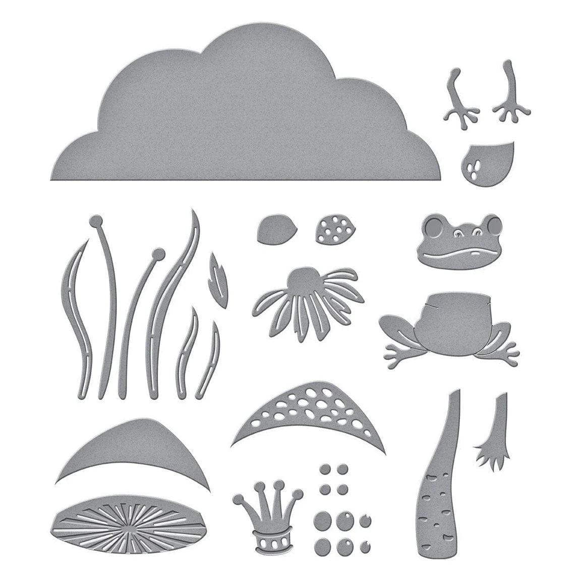 The Frog Prince Etched Dies from the Jump for Joy Collection offer a charming set of 18 thin metal cutting dies. This delightful collection allows you to create an adorable crowned frog and set the scene with additional whimsical elements such as a mushroom, grassy patches, flowers, and a cloudy backdrop. Centered around the playful frog theme, the Jump for Joy Collection is designed to bring smiles and a burst of positive energy to your crafting projects.