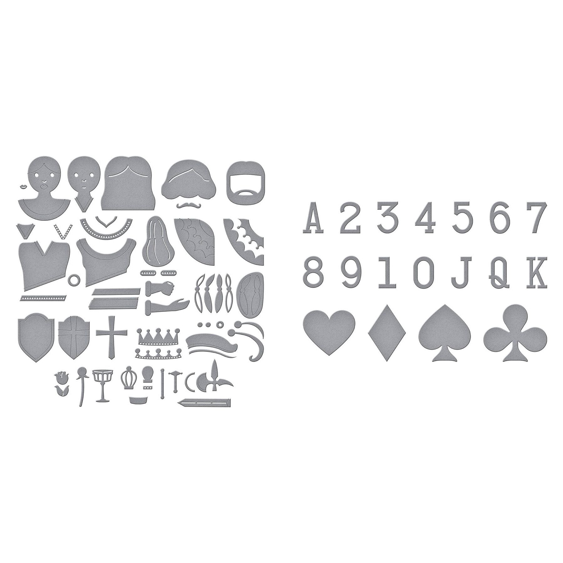 The Reversible Royal Court Etched Dies set contains 31 thin metal cutting dies to create layered, detailed face cards for the King, Queen, and Jack, complete with reversible designs reminiscent of traditional playing cards. The set includes accessories like crowns, clothing, hair, plumes, shields, swords, chalices, and flowers. The assembled face card figures range from approximately 2.5 x 3 inches (6.40 x 7.60 cm) to 3 x 3 inches (7.60 x 7.60 cm). Pair this set with Pip & Rank Etched Dies for card suits, letters, and numbers.