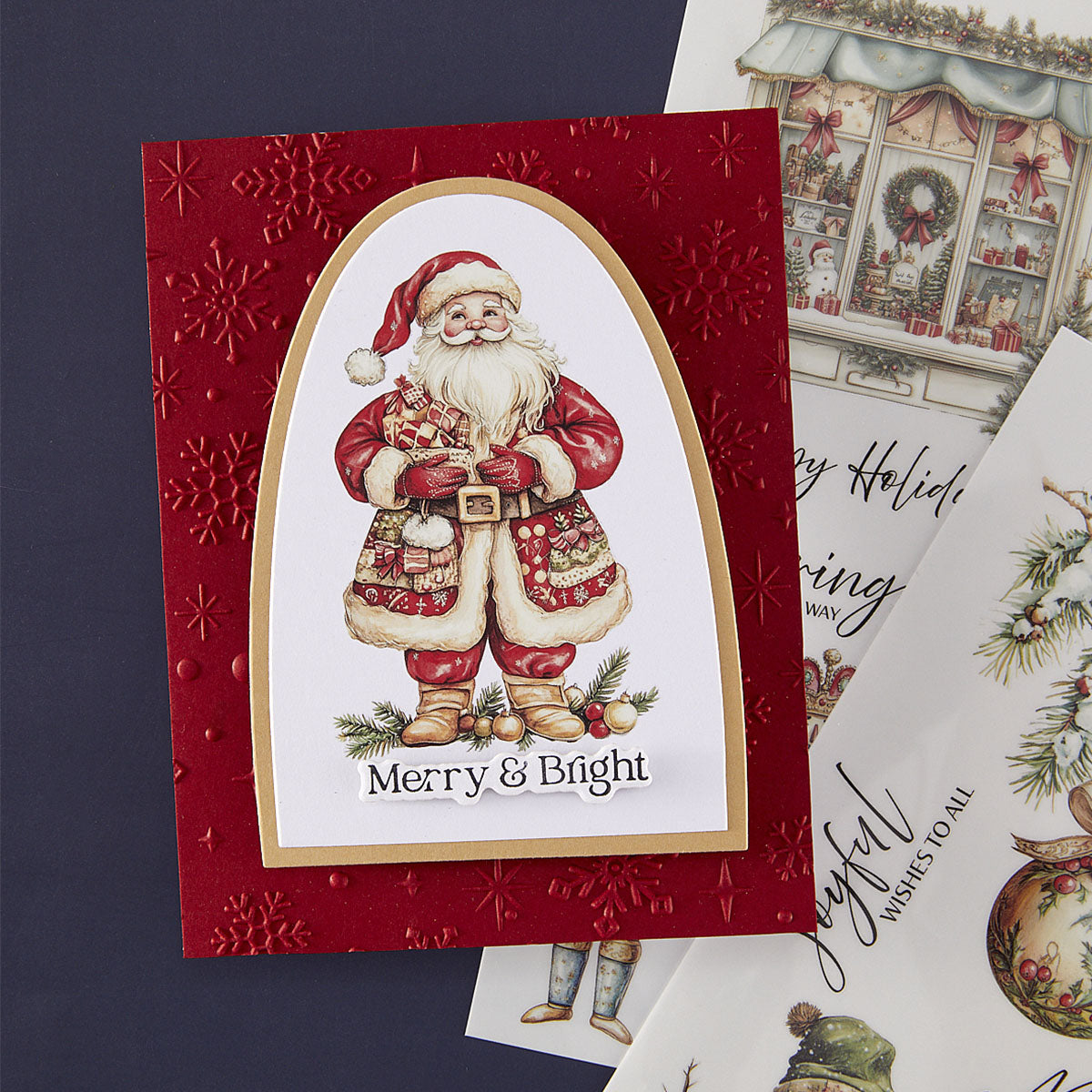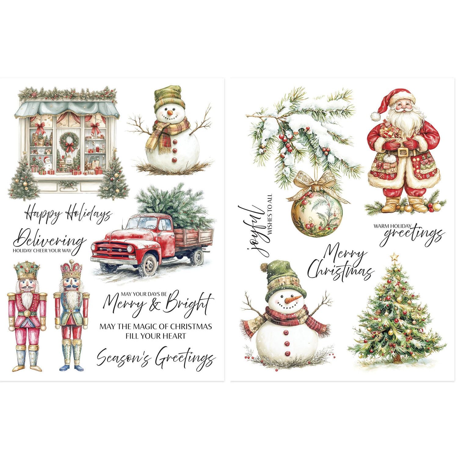 Spellbinders Joyful Wishes Rub-On Sheets are part of the Simply Made Collection. This festive illustrated set includes two 6 x 8-inch sheets of vibrant, high-quality rub-on transfers featuring 17 unique images and sentiments. Designs include snowmen in hats and scarves, nutcrackers, Santa Claus, decorated trees, a pickup truck carrying a tree, snowy pine branches with ornaments, and a cheerful holiday storefront. Sentiments include "Happy Holidays," "Delivering holiday cheer your way," "May your days be merry & bright," "Season’s Greetings," "joyful wishes to all," "Merry Christmas," and "Warm Holiday Greetings." These rub-ons are ideal for adding a seamless, hand-drawn look to your scrapbook layouts, cards, and journals—making it easy to achieve polished, professional results with minimal effort.