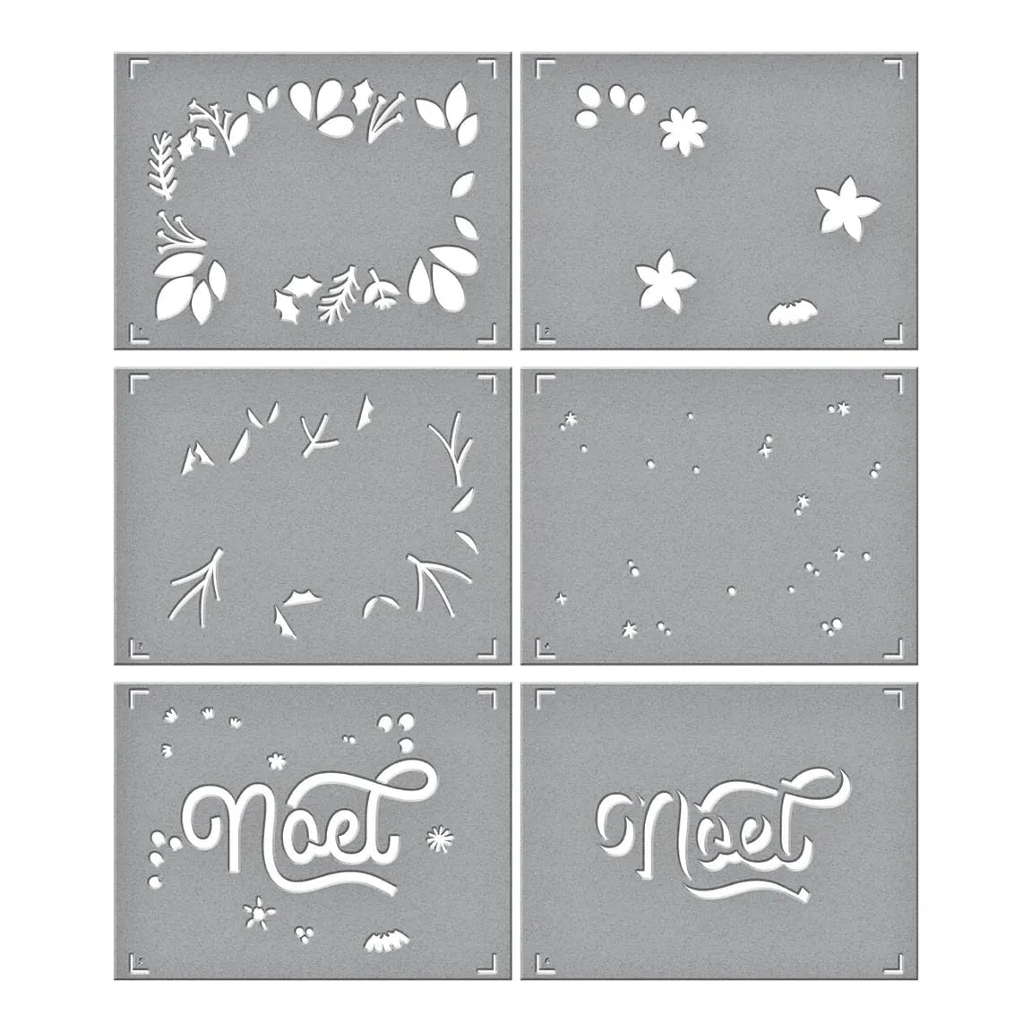 Introducing the Spellbinders Layered Noel Foliage Stencil and Etched Die Set, an enchanting bundle that pairs Layered Noel Foliage Stencils with its matching Noel Foliage Etched Dies. This fusion conjures a delightful burst of holiday florals and branches encircling the sentiment Noel. For added visual impact, the word can be die-cut and combined with the stencil design to create a bolder and more prominent effect.