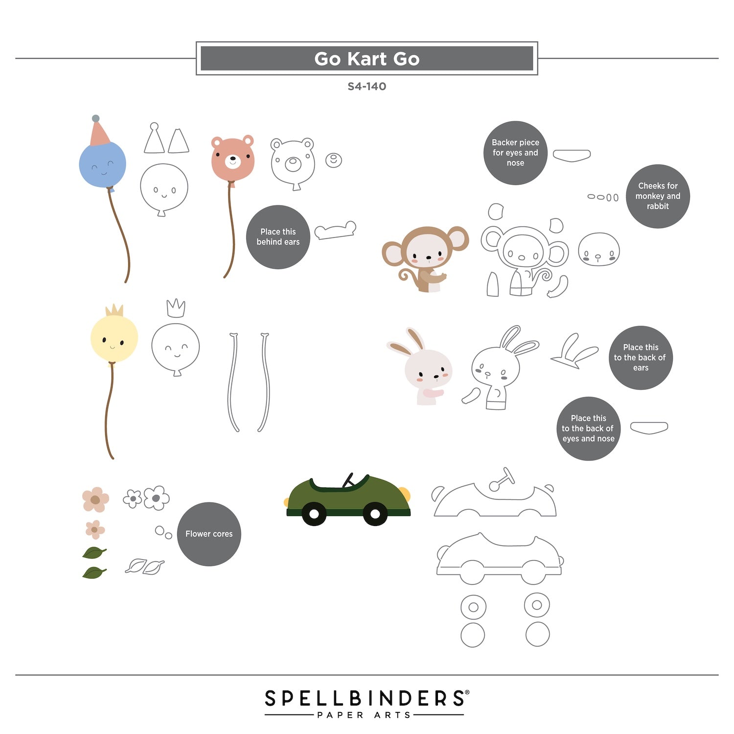 Go Kart Go Etched Dies — This set of 17 thin metal cutting dies creates an adorable tiny go-kart with two playful critter drivers—a monkey and a rabbit. Customize the scene with fun accessories, including a party hat, flowers, a crown, and a variety of balloons.