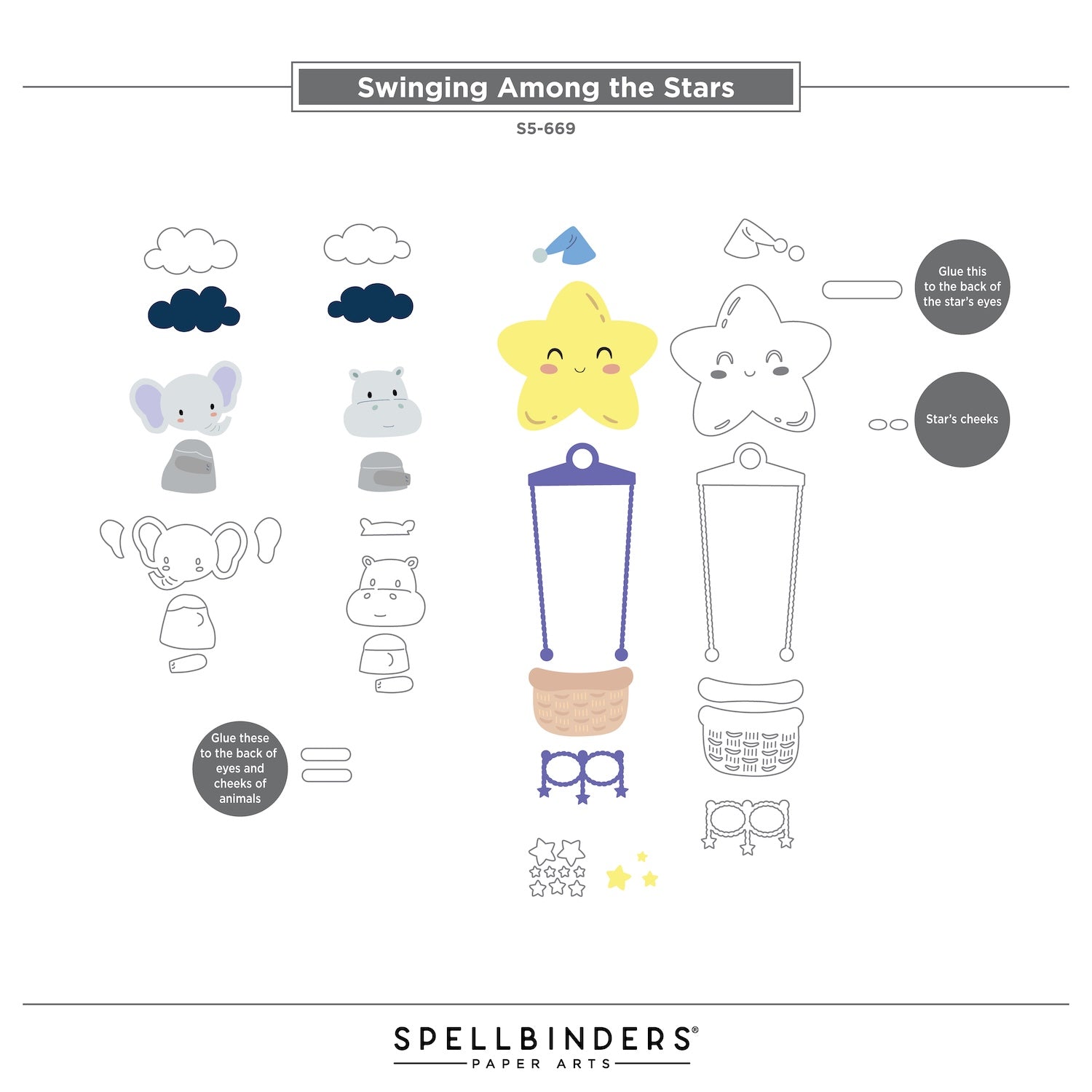 Swinging Among the Stars Etched Dies — This set of 13 thin metal cutting dies assembles a whimsical star-themed hot air balloon with two charming riders—a hippo and an elephant. The basket swings back and forth when a foam square is placed in the opening, adding an interactive element. Additional accessories include a night cap, clouds, and stars.