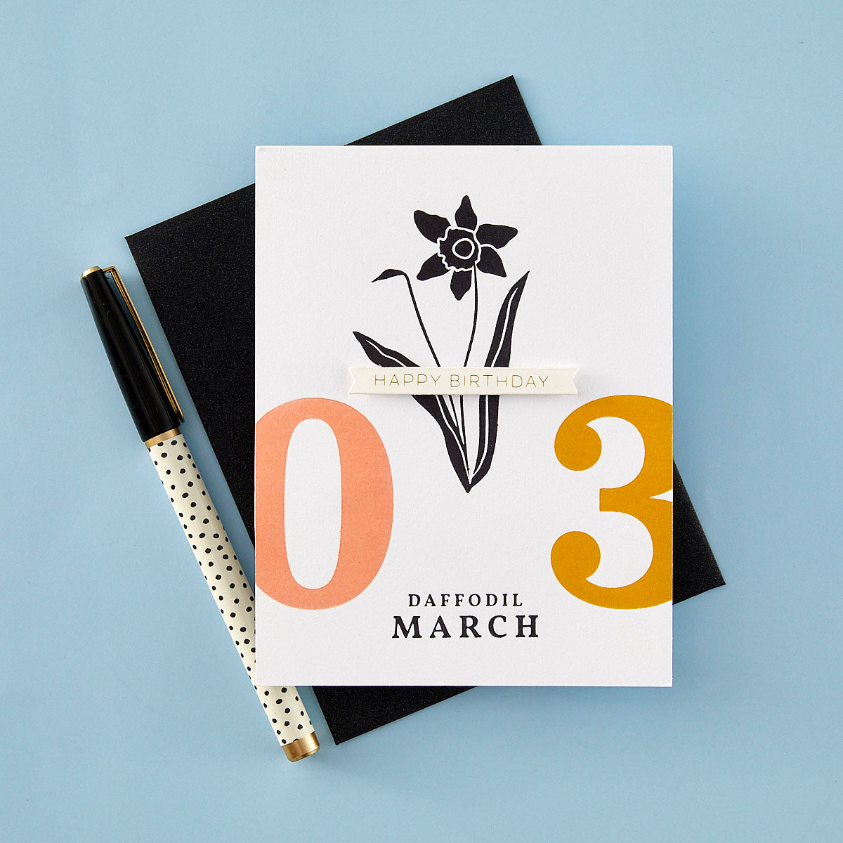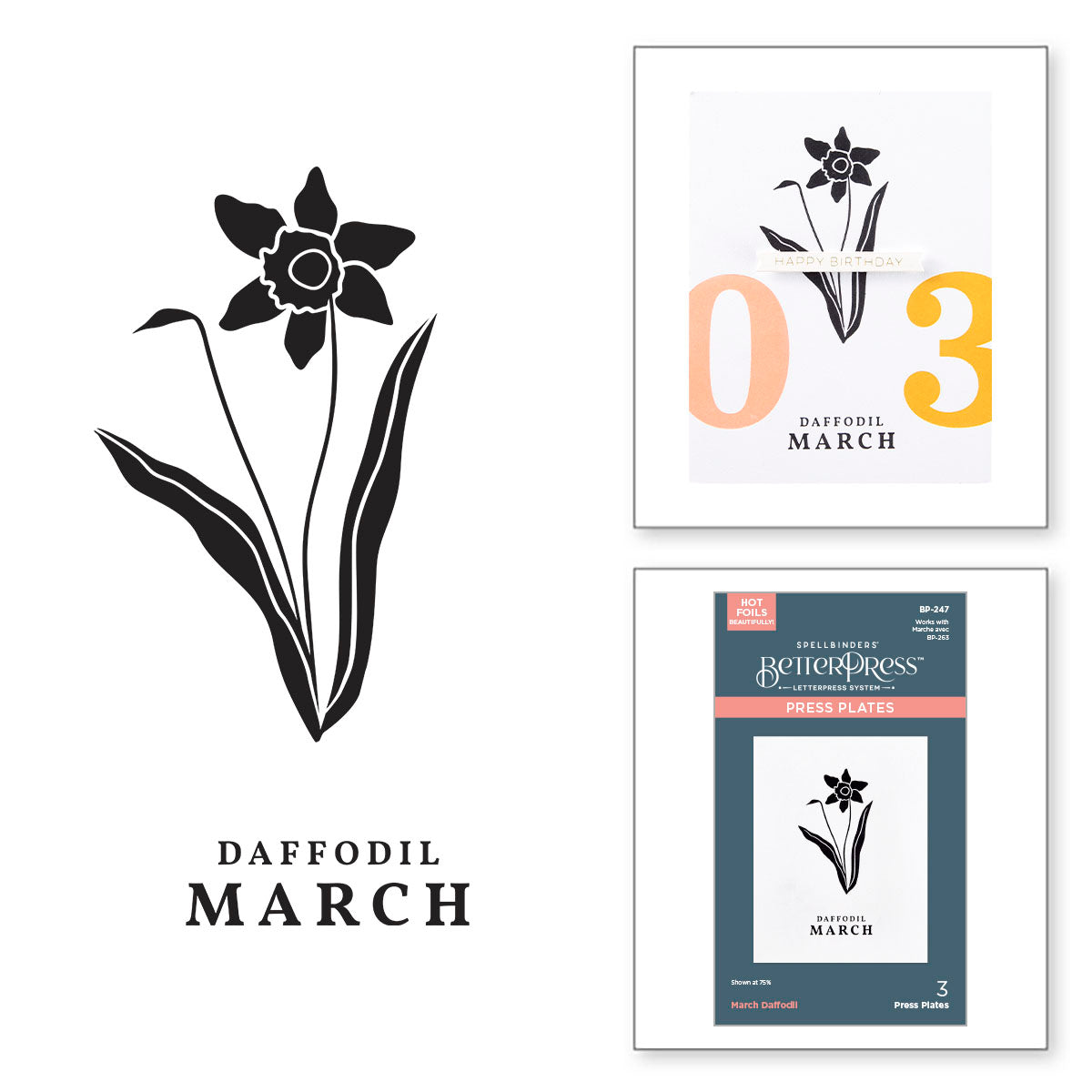 The March Daffodil Press Plates from the Florals Through the Year Collection embody resilience, an apt symbol for the transition from winter to spring. This set includes three plates featuring the daffodil as the focal flower, along with the month name and flower name, making it perfect for celebrating March birthdays. Use this versatile set to create a vibrant arrangement or highlight a single daffodil with a chosen sentiment.