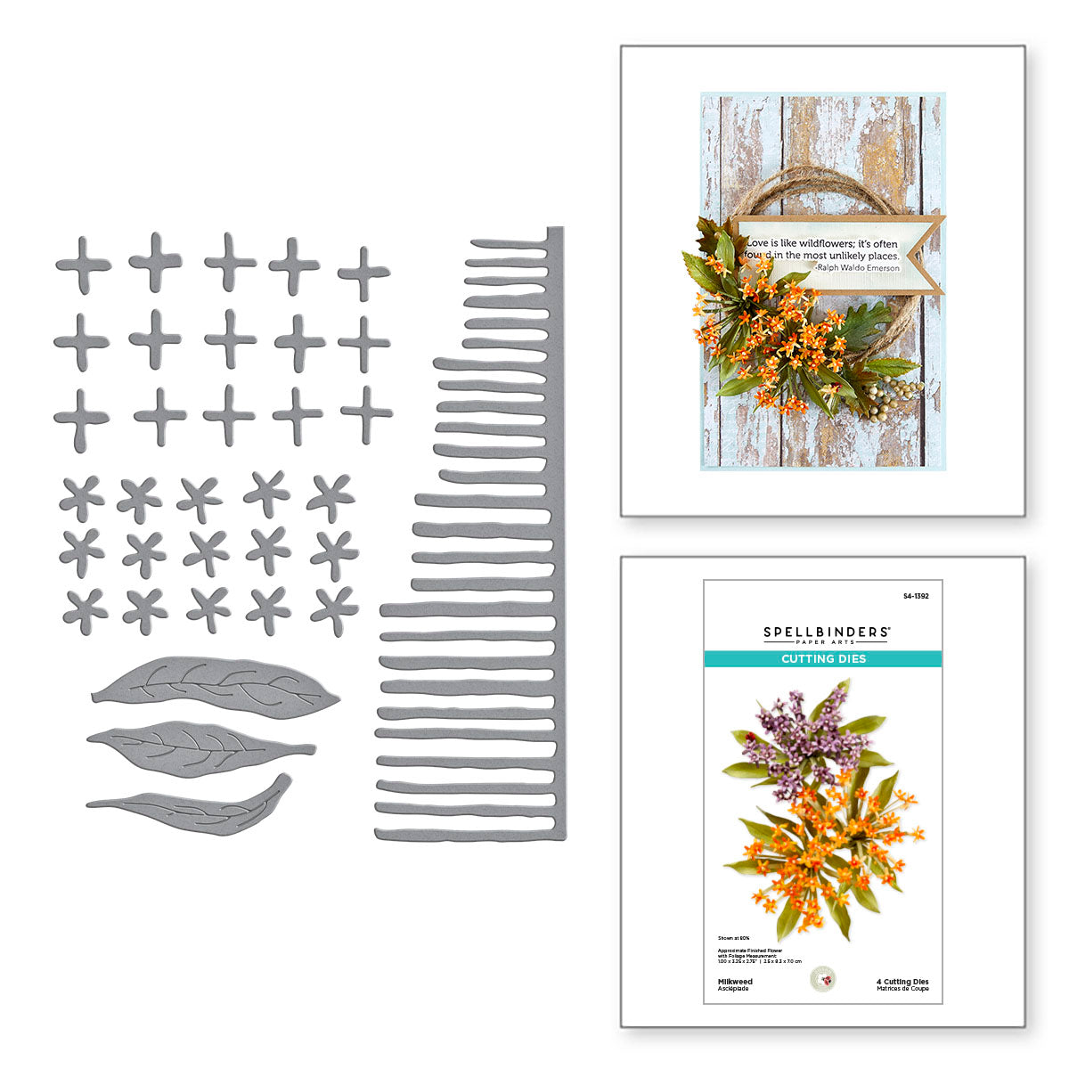 Spellbinders Milkweed Etched Dies are from the Through the Meadow Collection by Susan Tierney-Cockburn. This set includes four thin metal cutting dies that, when assembled, create a beautifully detailed ball-shaped cluster of milkweed flowers. Each bloom features five petals and five sepals with horn petals, adding intricate and realistic details to your floral designs. The finished flower and foliage measure approximately 1.00 x 3.25 x 2.75 inches / 2.50 x 8.30 x 7.00 cm. This set is perfect for adding delicate, dimensional floral elements to your cardmaking, scrapbooking, and other paper crafting projects.