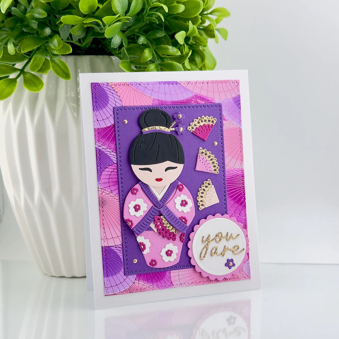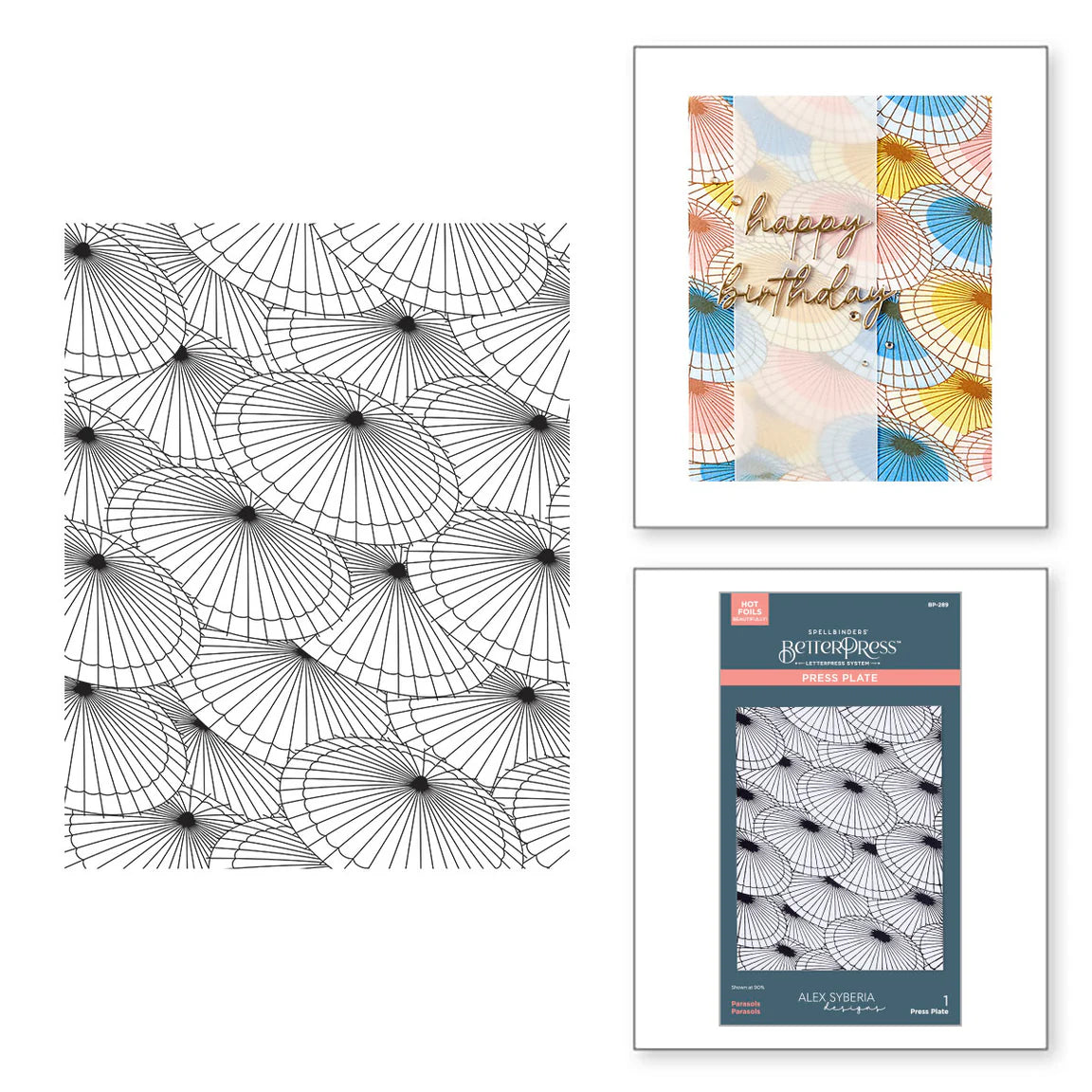 Parasols BetterPress Plate is part of the Spring in Kyoto Collection by Alex Syberia Designs. This plate impresses a background of wonderful and intricate Japanese parasols—a stunning background for any project. Use together with the coordinating Layered Parasols Stencil available in BD-0943 Spring in Kyoto BetterPress & Stencil Bundle to bring depth and dimension with ink, pastes and other mediums. Ink the plates with BetterPress Ink to be pressed against the BetterPress Cotton Card Panel and Sheets for a crisp letterpress design. Only four easy steps for professional results! Place the BetterPress Press Plate onto the Chase (magnetic platform to hold the press plate). Next, tape the Card Panel on the Platen (clear top plate with registration marks). Apply Ink onto the Press Plate. Make a Letterpress Sandwich and run it through a manual die-cutting machine. It’s an easy-to-use system that produces a professional stationery style with detailed impressions that can be felt to the touch. Plate is approximately 4.56 x 5.81 inches / 11.60 x 14.80 cm.