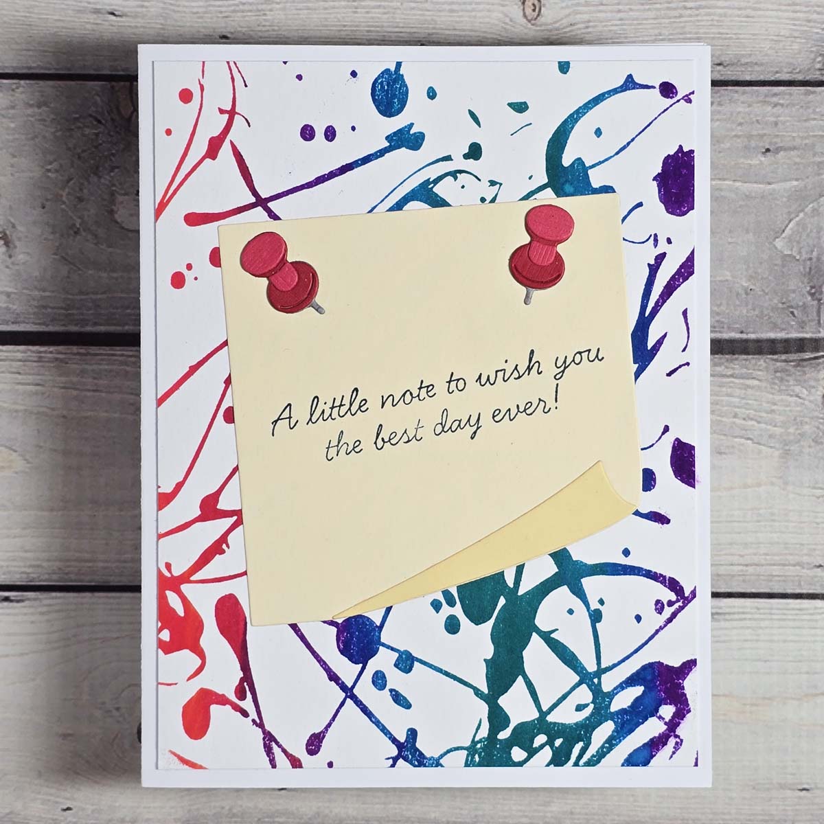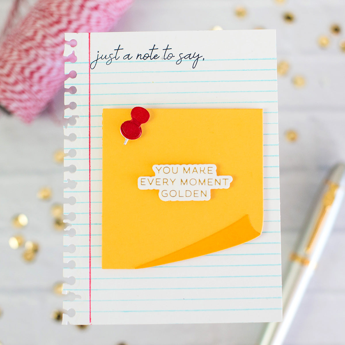 Push Pin Notes Etched Dies is from the Take Note Collection and includes five thin metal cutting dies. The largest die cuts a piece of square sticky note paper with a coordinating die, which creates a turned-up corner for extra interest. The other dies in the set assemble to create a dimensional push pin. Perfect piece to journal on in your projects, or to make a unique focal point on a card front! The finished note measures approximately 3.00 x 3.00 inches / 7.60 x 7.60 cm and the push pin measures Push Pin: 0.51 x 0.74 inches / 1.20 x 1.88 cm.
