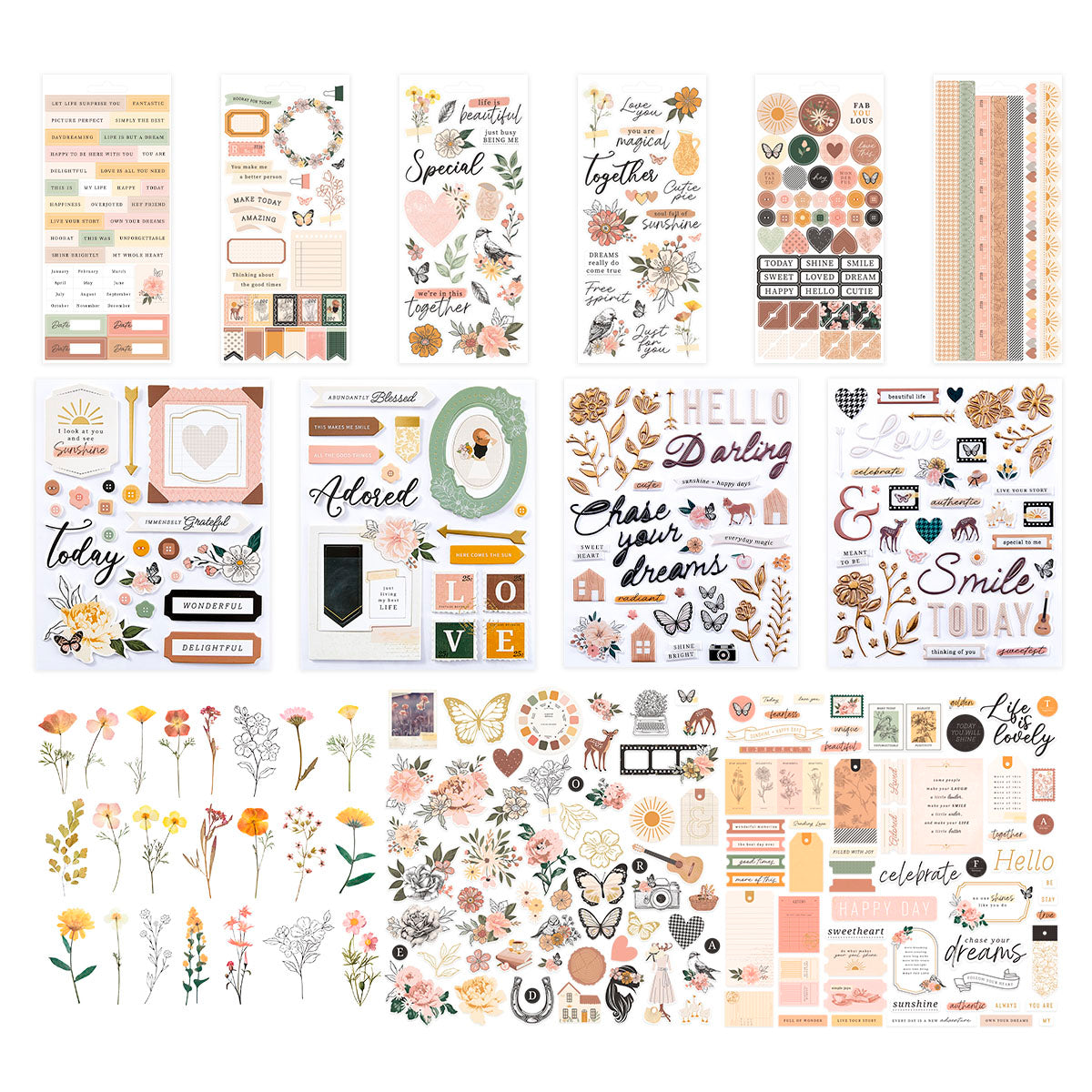 • Golden Afternoon Sticker Book 168821 – Six 4 x 8-inch sheets containing paper, clear, and washi stickers with month names, flowers, buttons, hearts, butterflies, borders, suns, wreaths, pennants, and text such as "just busy being me," "we’re in this together," "make today amazing," "Love is all you need," "hooray," "special," "fabulous," "fantastic," and "picture perfect."