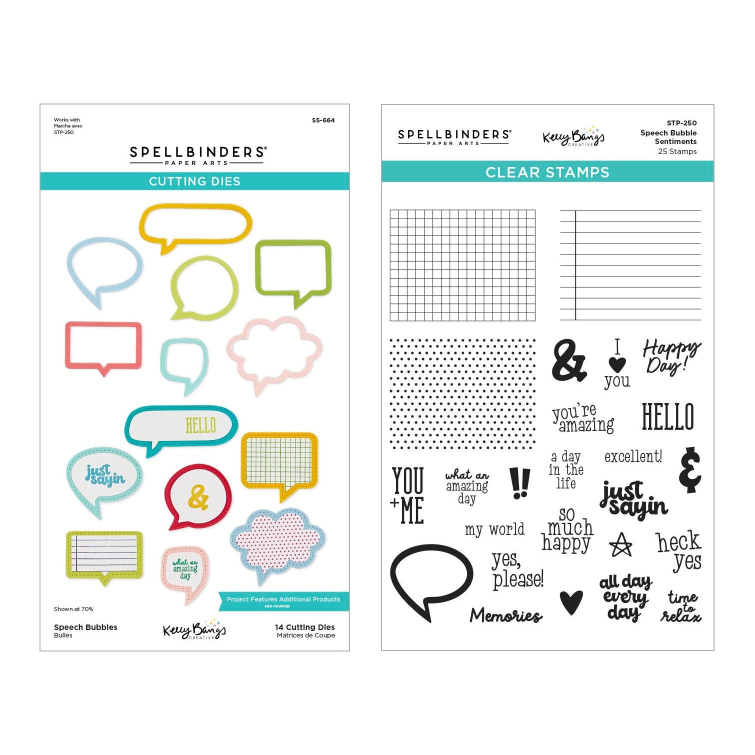 Spellbinders Speech Bubbles Sentiments Stamp and Die Bundle includes the Speech Bubbles Etched Dies (S5-664) and Speech Bubbles Sentiments Clear Stamp Set (STP-250). The stamp set features 25 clear stamp images, including 15 different sentiments, two accents, three punctuation marks, three background designs, and a circle speech bubble. Designs include polka dots, a grid, ruled paper, a speech bubble, ampersands, hearts, and stars. Sentiments include "I heart you," "yes please," "so much happy," "you’re amazing," "excellent," "hello," "memories," "heck yes," "what an amazing day," "my world," "you + me," "a day in the life," "just sayin," "all day every day," and "time to relax." The die set features 14 thin metal cutting dies, offering a fabulous variety of speech bubbles in different shapes and sizes, including cloud, long oval, rectangle, square, and more. Combine these stamps and dies to add fun, layered expressions to your projects. The Just Sayin’ Collection is bursting with bright colors and a vintage vibe in every piece. Document everything you want to say with this cheerful collaboration between designer Kelly Bangs and Spellbinders.
