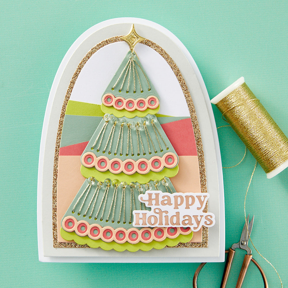 Stitched Holiday Tree Etched Dies are part of the Stitched Bright Collection with a set of 15 thin metal cutting dies. When cut and assembled, it makes an adorable three-layer holiday tree with a modern star topper. A super fun tree design!