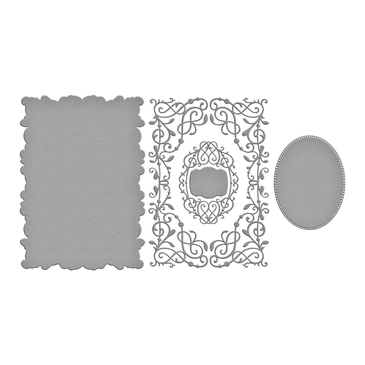 The Spellbinders Timeless 5 x 7 Cardfront Etched Dies are a beautifully crafted set from the Timeless Collection, consisting of six thin metal cutting dies. This set is designed to completely decorate an A7 (5 x 7 inch) card front with a delicate and intricate lace design, providing an elegant and sophisticated appearance. When the dies are nested and used together, they create a stunning lace cardfront that is sure to impress.