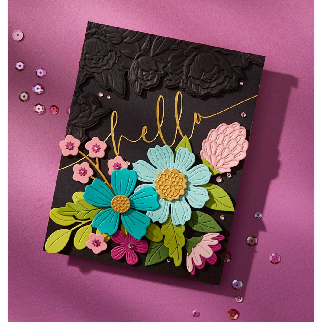 Vivid Blooms Etched Dies are part of the Vivid Expressions Collection. This set includes 17 thin metal cutting dies that create a stunning assortment of beautiful florals. These versatile dies can be used individually to craft elegant floral accents or combined to design a breathtaking bouquet. Perfect for cardmaking, scrapbooking, and other creative projects, these intricate floral designs add depth and dimension to your creations. The finished Vivid Blooms Bouquet, as pictured on the package, measures approximately 4.05 x 5.04 inches (10.30 x 12.80 cm).