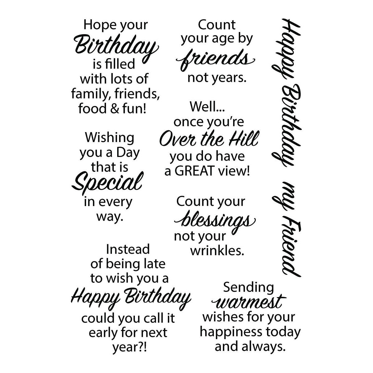 The Stampendous Birthday Messages Clear Stamps are a delightful addition to the All the Sentiments Collection by Stampendous. This set features nine stamps, each designed to convey fun and festive birthday greetings. With seven different birthday messages to choose from, you have a variety of options for both the outside and inside of your cards. Whether you're crafting birthday cards for loved ones or creating handmade invitations, these stamps offer versatile and cheerful sentiments to celebrate special occasions.
