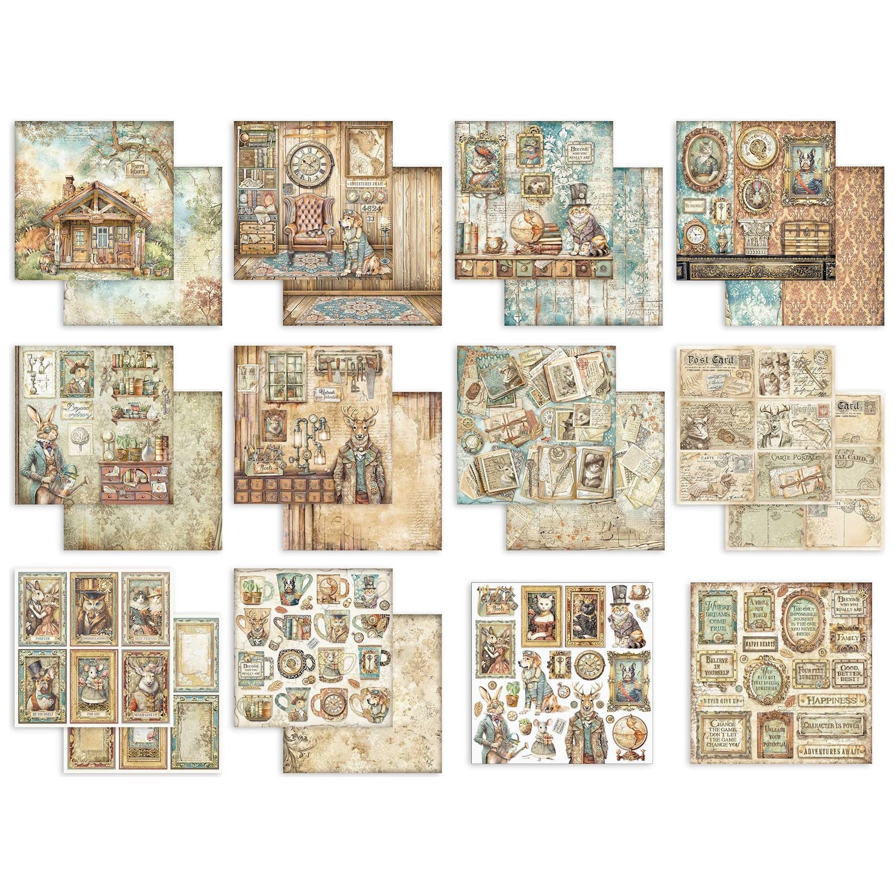 Alterego presents an alternative world where your second nature is revealed through animals and their behaviors. This collection is both humorous and serious, with subtle sarcasm woven into the designs. Discover your and your friend’s spirit animals among the characters. This paper pad contains ten double-sided sheets, each measuring 12x12 inches and crafted from high-quality cardstock weighing approximately 190 grams. The designs feature a variety of scenes including cabins in the forest, trees, collages, and interiors of cozy homes. You'll find whimsical animals such as dressed-up cats, dogs, bunny rabbits, and deer, along with elements like books, weathered wood, portraits, damask prints, steampunk influences, tools, distressed paper, envelopes, and vintage photographs. The set also includes playful postcards and notecards with sentiments such as "Forever," "Congratulations," "Best friends," "Be yourself," "For you," "Never give up," as well as designs featuring teacups and mugs, adding a quirky and imaginative touch to your crafting projects.