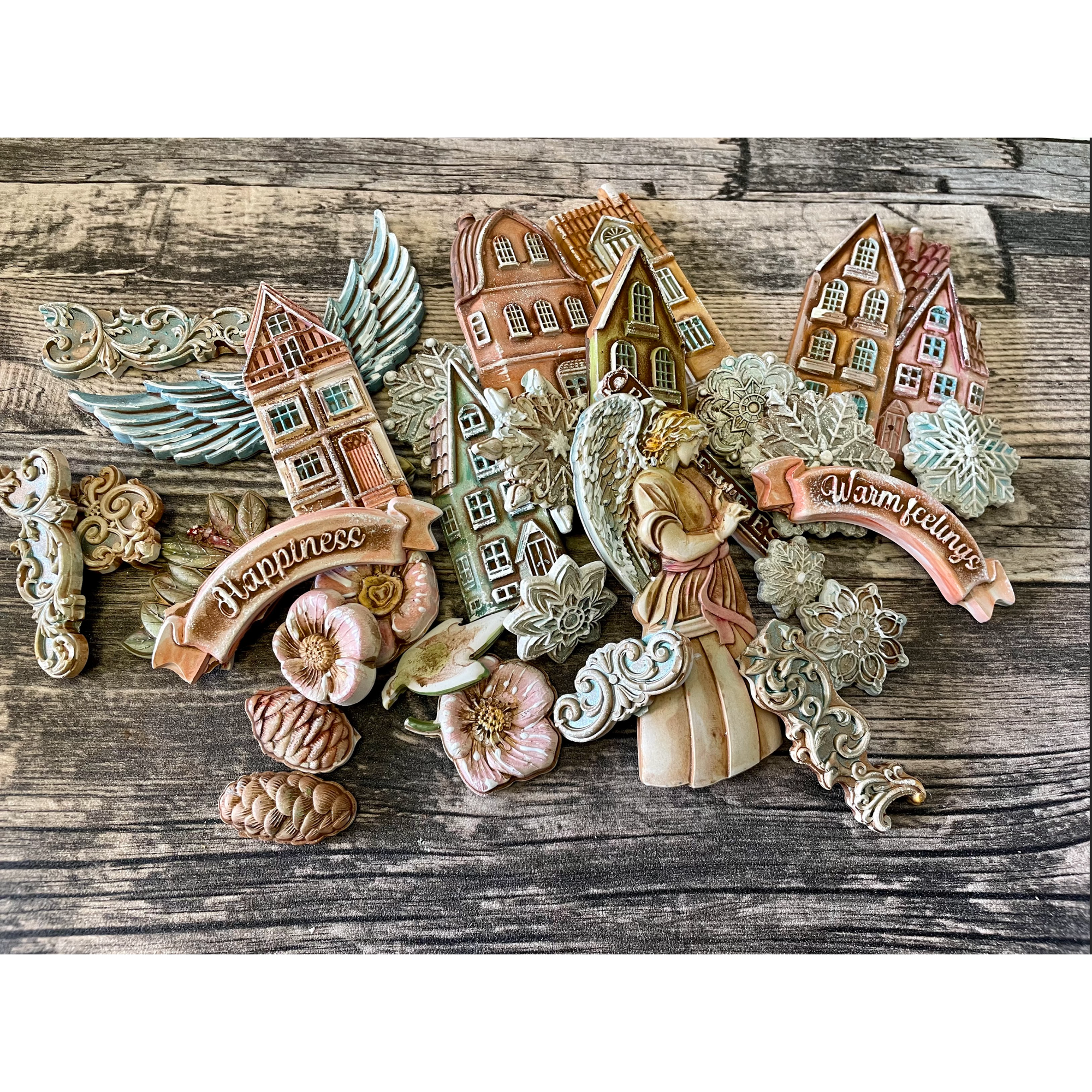 The Stamperia Cozy Christmas Houses A4 Soft Mold is a versatile tool for creating delightful holiday-inspired elements for your paper and mixed media projects. This MaxiMold allows you to pour soft clay, resin, or other moldable materials into the mold and wait for them to dry, resulting in easily removable shapes. The mold features 9 designs on an 8.25 x 11.75 inch surface, allowing you to create your own holiday village with 7 charming houses. Each house is complete with lots of windows and doors, adding intricate details to your creations. The mold also includes two banners with the sentiments "Happiness" and "Warm feelings," which can be used to further embellish your projects.