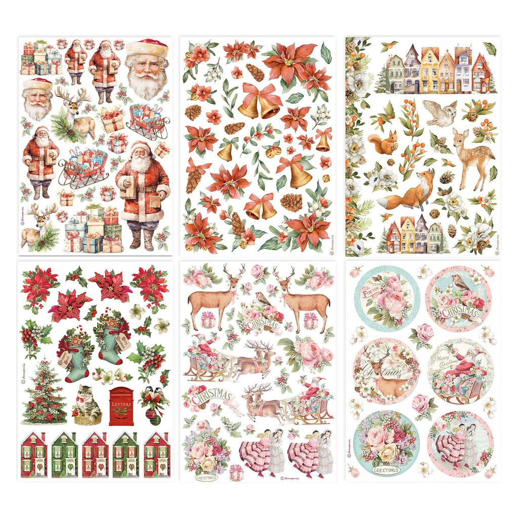 Stamperia Classic Christmas Rice Paper offers a delightful collection tailored for crafting holiday-themed cards. This pack of rice paper includes six printed sheets of acid-free rice paper, each sized at approximately 8.3 x 11.7 inches and weighing 28 grams. With these rice papers, you can effortlessly create captivating backgrounds for your journal pages or cards. Working with rice paper is a breeze; you can easily adhere it to various surfaces using adhesive, allowing you to incorporate these lovely designs into your scrapbooking, card making, mixed media, and other crafting projects. The designs encompass a variety of festive motifs such as poinsettias, reindeer, bells, Santa Claus, woodland animals, houses, gifts, sleighs, stockings, Christmas trees, vintage ice skaters, roses, and more.