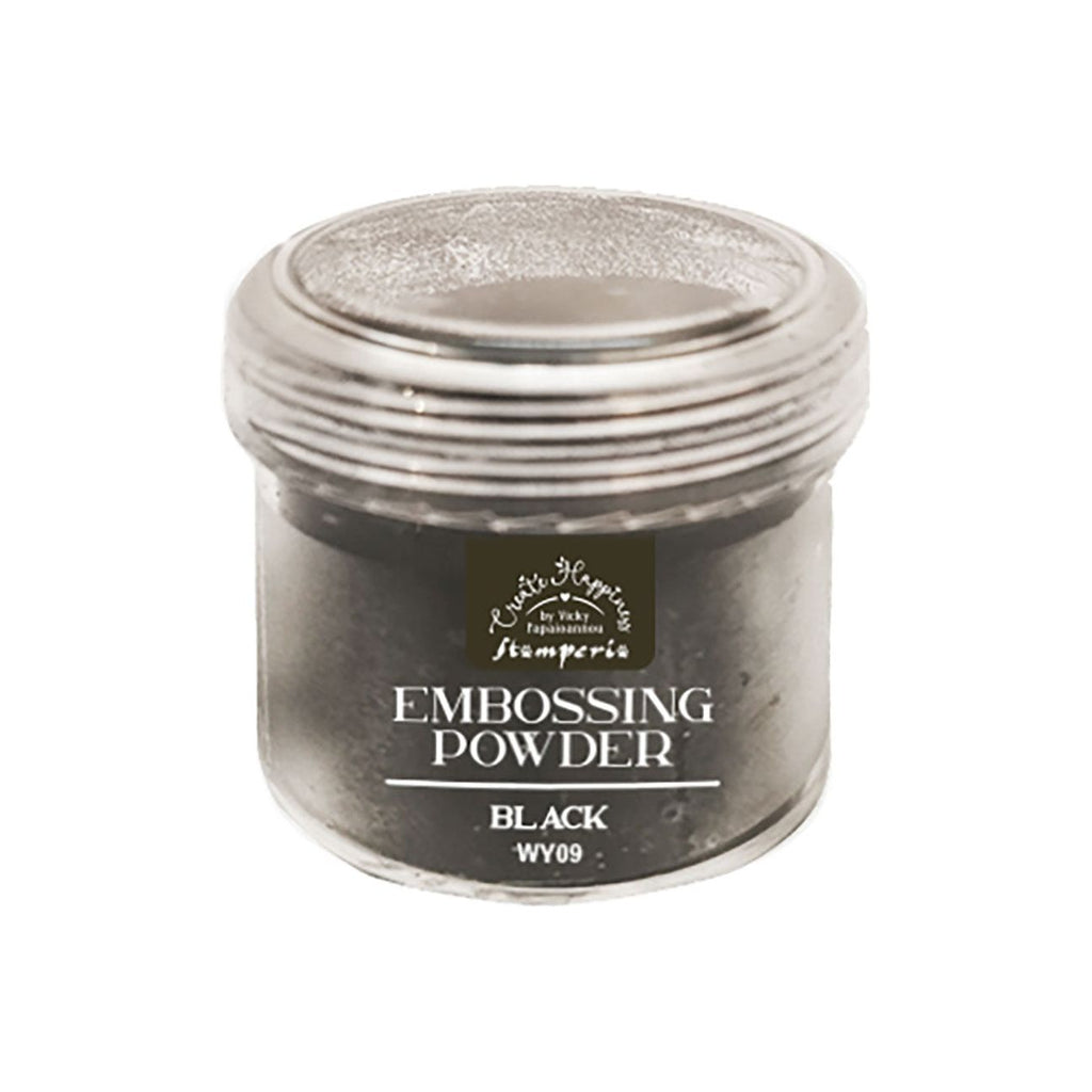 The Stamperia Black Embossing Powder, part of the Create Happiness Art Journaling Collection designed by Vicky Papaioannou, is packaged in a jar containing 0.63 ounces (18 grams) of black embossing powder. It's an ideal choice for adding a bold and defined touch to your crafting projects.