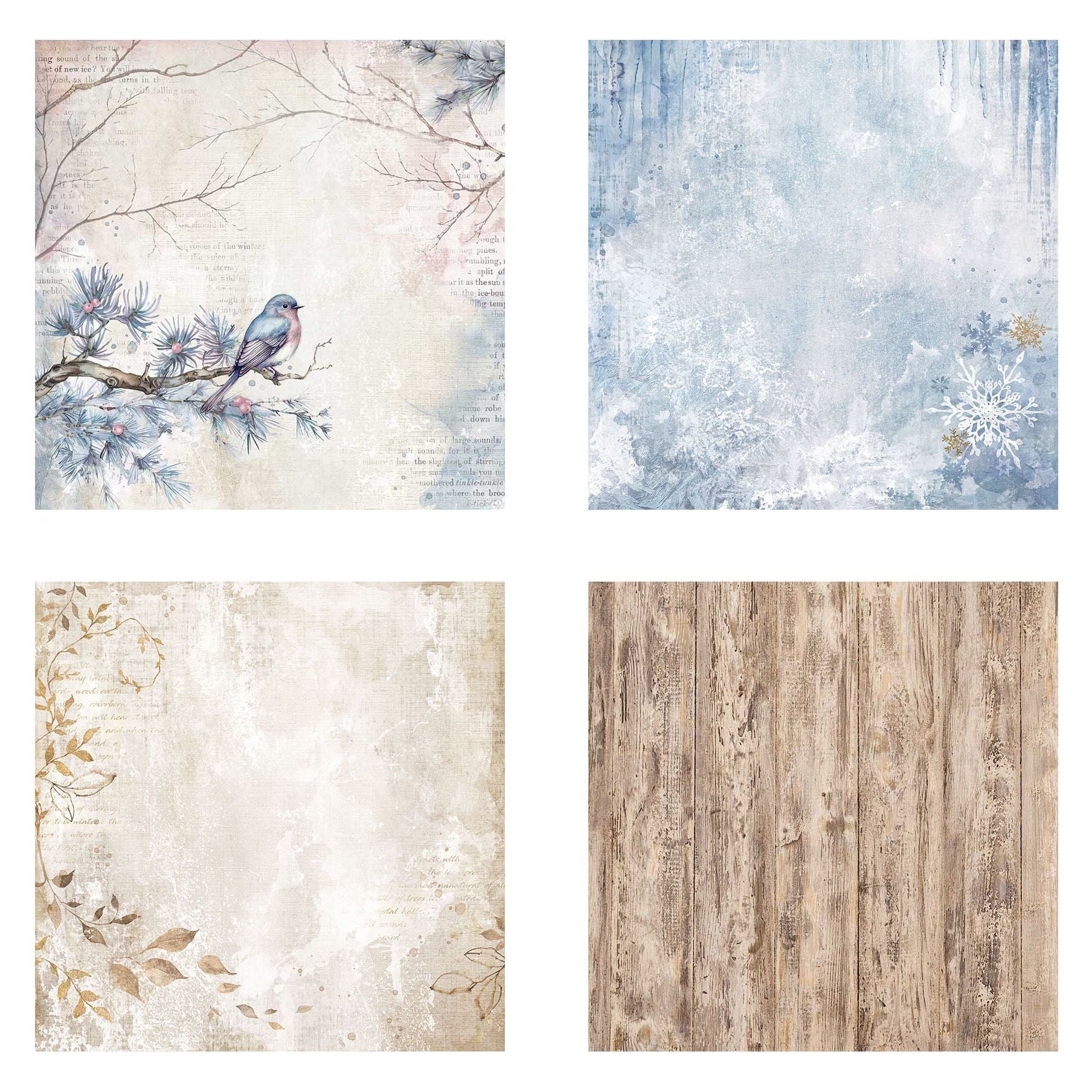 The Stamperia Dewdrops Collection, part of the Create Happiness Art Journaling Collection designed by Vicky Papaioannou, exudes a surreal energy, blending dreamlike landscapes with vibrant hues to capture the moment where reality meets imagination. This set includes four 12x12-inch versatile fabric sheets. These sheets can be sewn by hand or machine, or adhered to surfaces using craft glue, making them perfect for adding textile elements to creative projects. Washable by hand in cold water, the designs include brown wooden slats, blue winter scenes with snowflakes and icicles, cream with foliage and script, and a bird on a pine-filled branch.