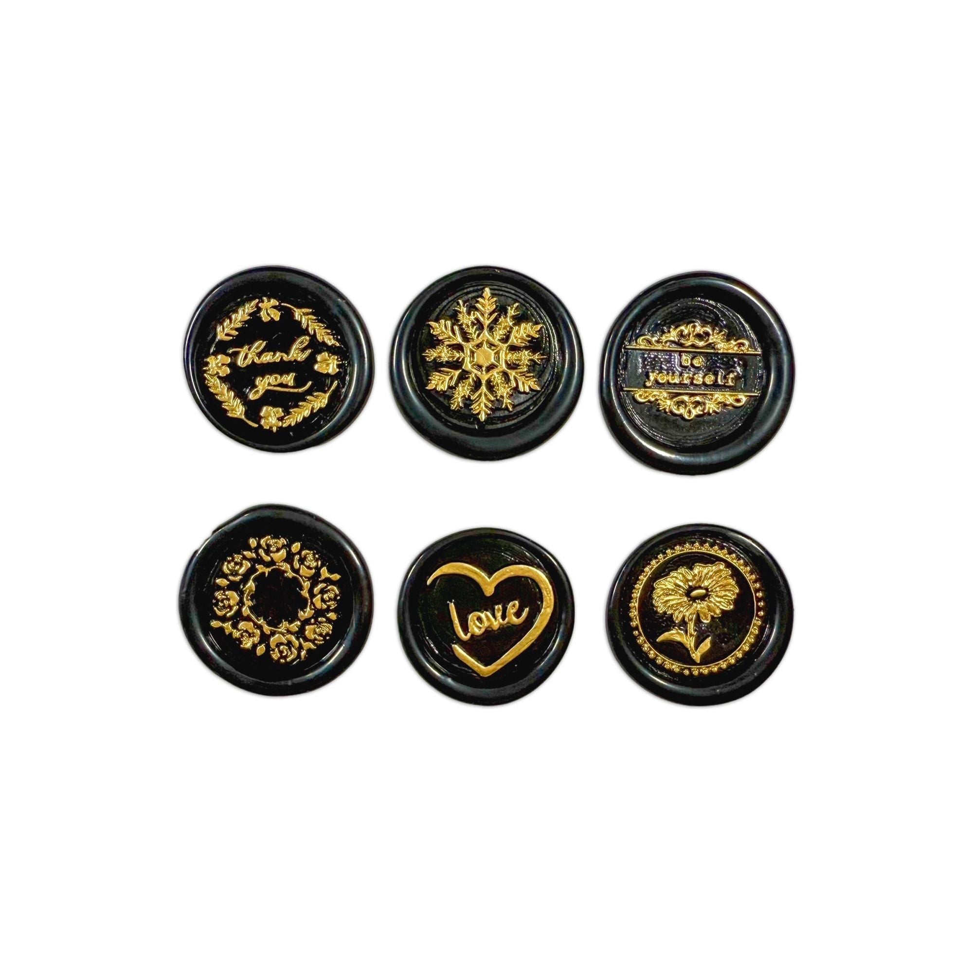 Stamperia Everyday Set 6 Seals is part of the Wax & Seals Collection by Liu Journal. This set includes 6 copper seals, packaged in a practical box for easy storage. The designs are versatile and suitable for everyday use or any occasion. Each seal measures approximately one inch in diameter and features unique designs, including a circle of flowers, the word "Love" inside a heart, a single flower surrounded by a dotted circle, the words "Be Yourself," a snowflake, and the words "Thank You" surrounded by foliage. After use, simply clean the seals with a cloth to maintain their quality. These seals are compatible with the Stamperia Handle With Seal For You wax01, sold separately.