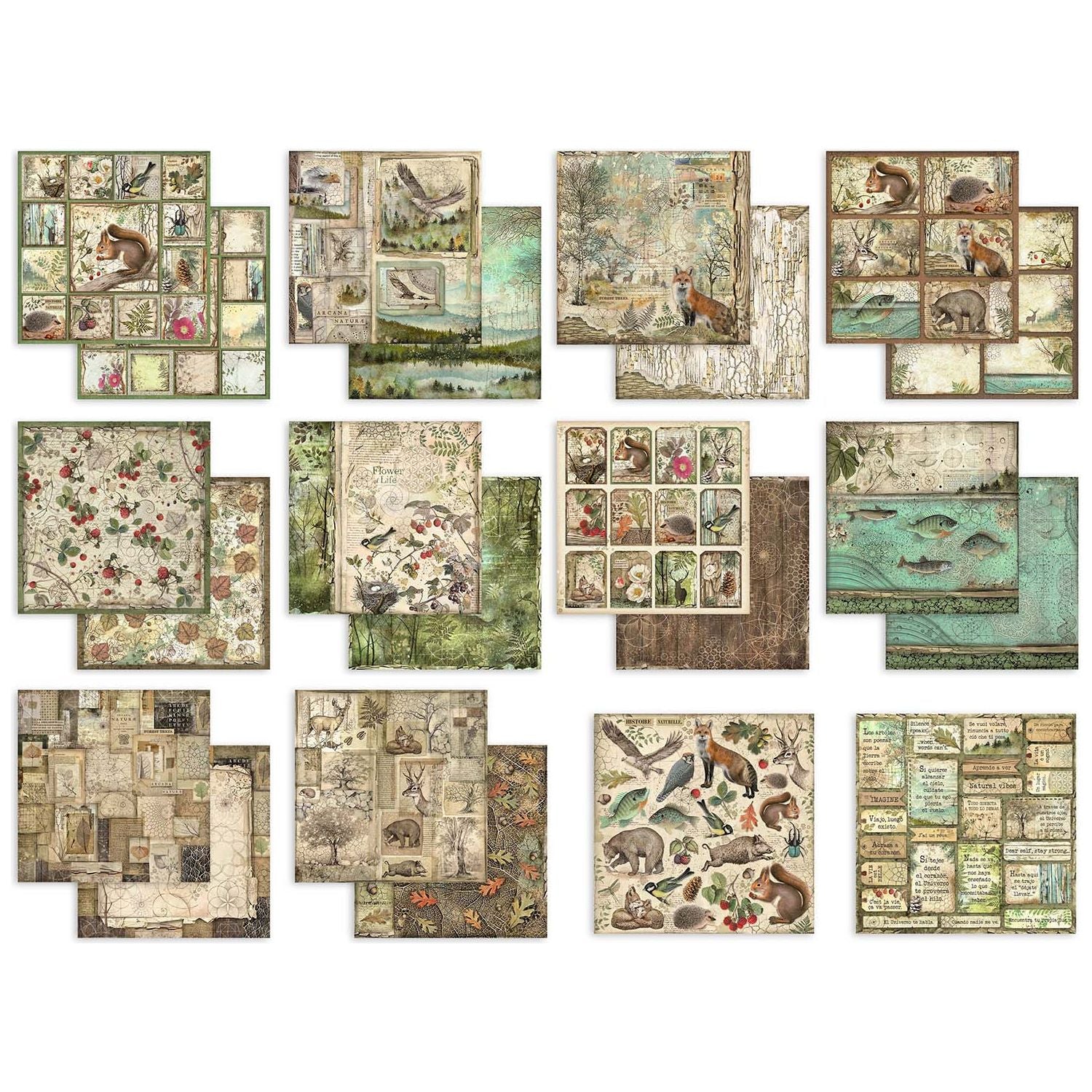 Forest by Cristina Radovan captures the magic of Nature, showcasing both what we see and the hidden patterns within. Animals, plants, air, and water are depicted in perfect harmony. This paper pad contains ten double-sided sheets, each measuring 12x12 inches and crafted from high-quality cardstock weighing approximately 190 grams.