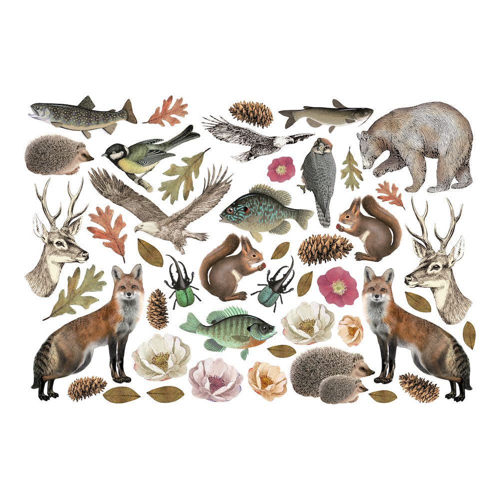 Forest by Cristina Radovan captures the magic of nature, showcasing both the visible and hidden patterns in perfect harmony. This 5x5-inch package contains 46 assorted adhesive die cuts, each printed on durable 800gr cardboard. The ephemera includes Fall leaves, pinecones, flowers, beetles, and animals such as deer, birds, fish, foxes, bears, and hedgehogs. These die cuts are perfect for adding a nature-inspired touch to your crafting projects.