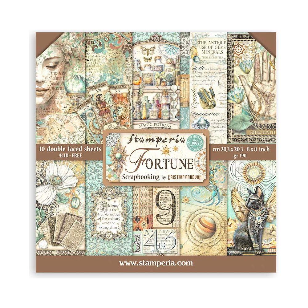 Embark on a creative expedition with the Fortune Collection, where each product serves as a canvas for storytelling and artistic expression. Designed by Cristina Radovan, this line features crafting materials steeped in antique and esoteric imagery, endowed with textures and symbols drawn from Egypt's wisdom and mystical past. This paper pad contains ten double-sided sheets, each measuring 8 x 8 inches and crafted from high-quality cardstock weighing approximately 190 grams. Within its pages, you'll discover a plethora of enchanting designs, including fortune teller motifs, palmistry, astronomy, planets, the universe, numbers, tarot cards, ethereal faces, potions and elixirs, star signs, pyramids, winged cats, books, compasses, notecards, ephemera, labels, birds, crystal balls, pillars, moons, candles, and much more. Adding to its allure, the paper pad features sentiments on the labels, such as "Alchemy is the transformation of the ordinary into the extraordinary," "Transform your life," "Believe in your dreams," "There is nothing you can’t achieve," "Love potions," and others.