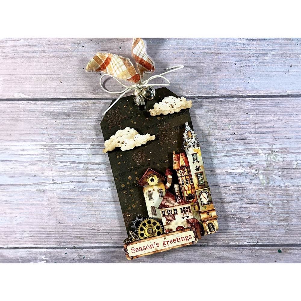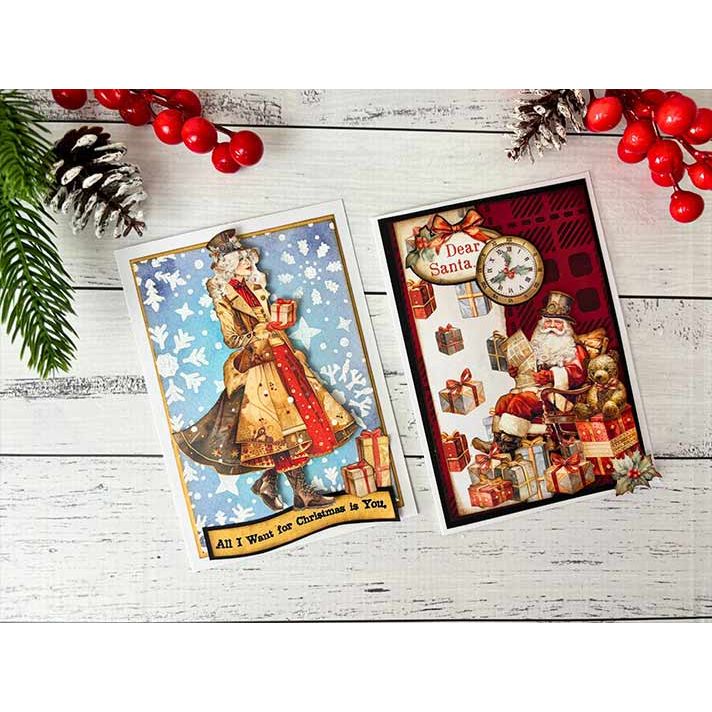 Stamperia Gear Up For Christmas, designed by Farrel Tailor for the Romantic Collection, brings a steampunk twist to the holidays. This 5.5 x 7-inch clear acrylic stamp set includes 9 pieces, featuring an empty snowglobe, a snowglobe with a row of houses, snowfall, gifts, a rocking horse, a steampunk teddy bear, musical notes, and the lyrics "All I want for Christmas is you," and "On the first Day of Christmas my true love gave to me a partridge in a pear." This versatile stamp set is perfect for adding detailed and festive elements to your holiday-themed crafting projects.