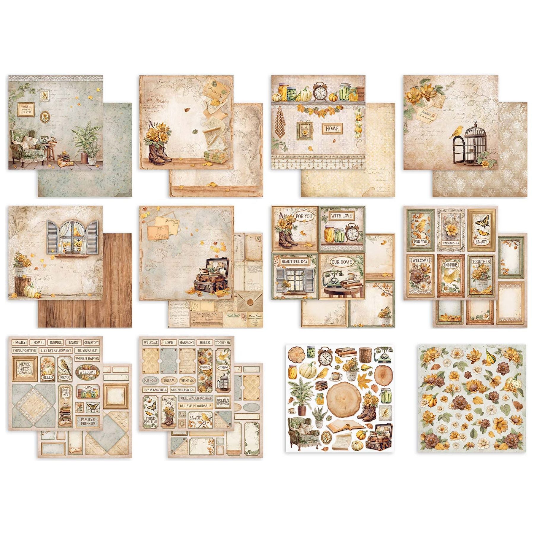 Golden Harmony by Emilia Sieradzan embraces warm colors for creating elegant papercrafts. This paper pad contains ten double-sided sheets, each measuring 8x8 inches and crafted from high-quality cardstock weighing approximately 190 grams. The designs feature florals, damask prints, boots with flowers, vintage luggage, open windows with shutters, scenes from inside a home, birds, birdcages, ATC and note cards, tags, and labels with sentiments like "family," "home," "inspire," "enjoy," "be yourself," "never stop dreaming," and more. Ephemera include blooms, pumpkins, wood slices, clocks, jarred vegetables, vintage luggage, telephones, books, and more. Perfect for enriching your crafting projects!
