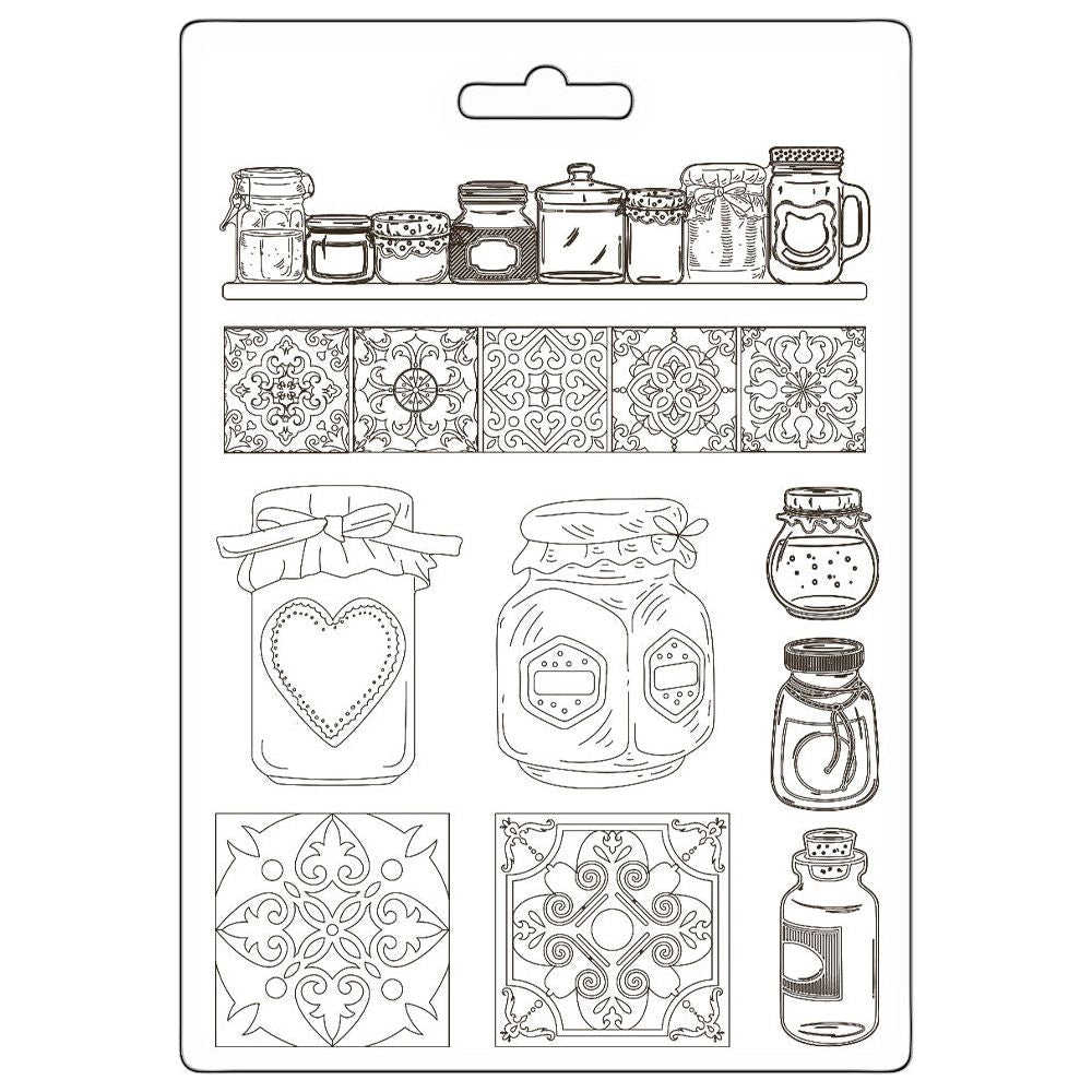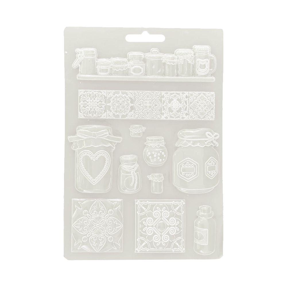 Golden Harmony by Emilia Sieradzan embraces warm tones for creating elegant papercrafts. This versatile soft mold is designed to work with a variety of crafting materials, including paste, glossy gel, soft clay, and more. Simply fill the mold, let it dry, and then remove the detailed shape. When using Stamperia Sculpture Paste, the impression remains flexible, allowing you to cut or manipulate it as needed. Measuring approximately 6 x 8.25 inches, this soft mold features 9 designs, including a shelf of jars, a row of tiles, more jars for treats or homemade jam, and additional decorative tiles—ideal for adding unique embellishments to your projects.