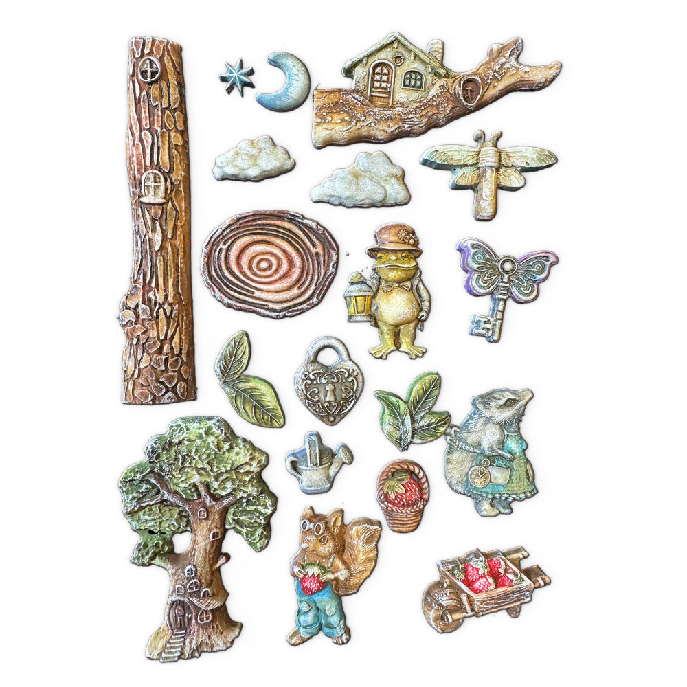Hidden Grove, designed by Farrel Tailor for the Romantic Collection, invites you into a whimsical woodland world filled with charming gnomes, strawberries, and natural elements. This versatile soft mold is ideal for use with materials like soft clay, resin, and more. Simply fill the mold, let it dry, and then remove the detailed shapes with ease. Perfect for paper and mixed media projects, the mold features 20 enchanting designs on an approximately 8 x 11-inch surface. The designs include a frog, badger, squirrel, gnome homes, trees, clouds, stars, a heart lock, a key, a watering can, leaves, and more.