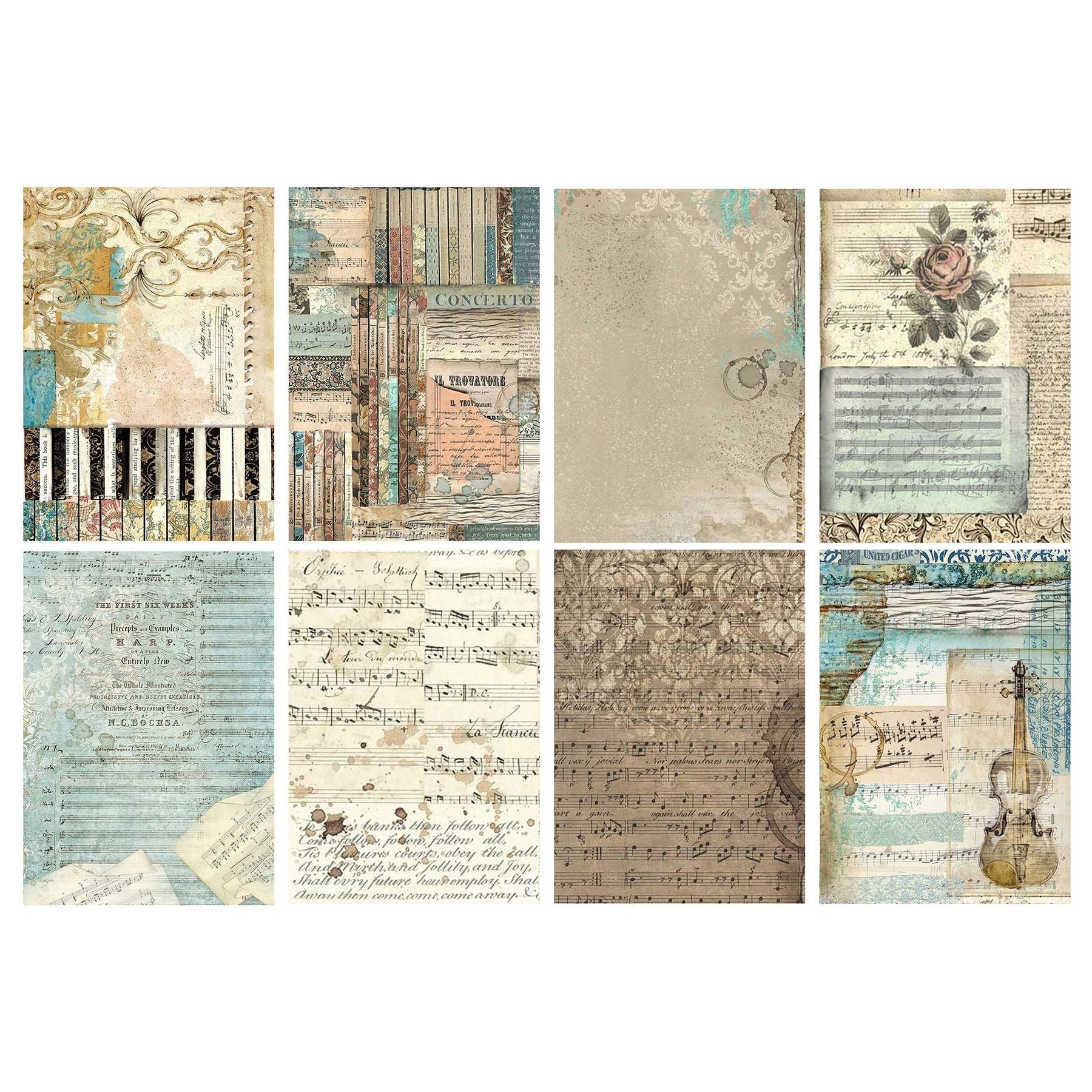 Music is poetry. Music connects people. Music can change the world. The Stamperia Music collection embodies perfect harmony in design, inspiring creativity. This set includes eight sheets of acid-free rice paper, each measuring approximately 4.13 x 5.83 inches and weighing 28 grams. Known for its lightweight and translucent qualities, rice paper is perfect for crafting projects, offering endless creative possibilities. The A6 size is ideal for adding intricate details to scrapbook layouts, cards, or mixed-media art. Designs feature collages of sheet music, damask patterns, violins, flowers, concerto tickets, ink spills, book spines, and more, capturing the essence of timeless musical beauty.
