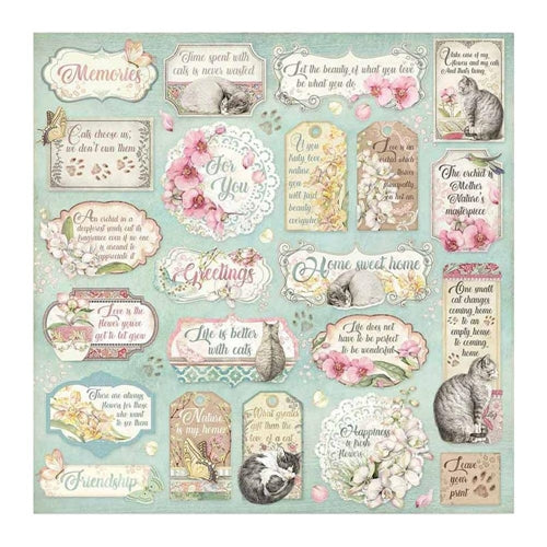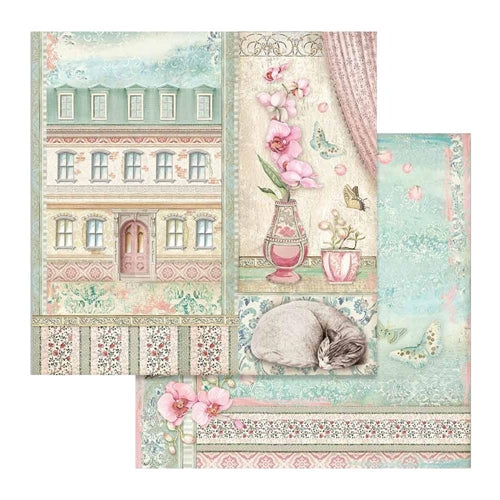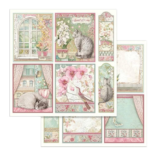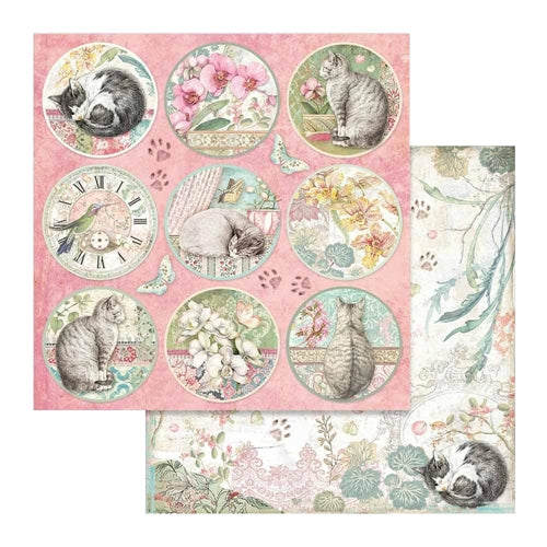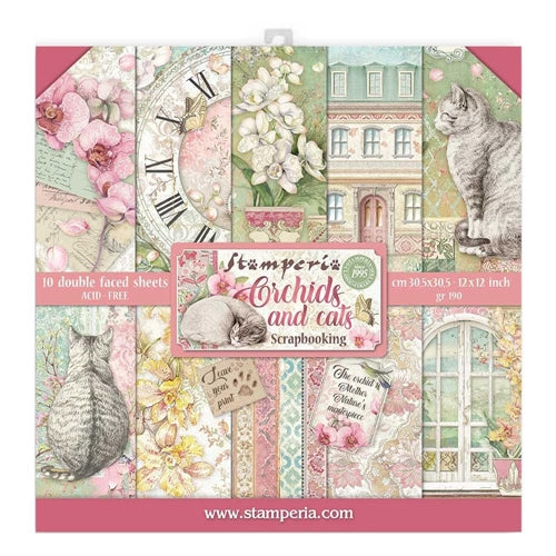 Orchids and Cats, beloved in many homes, embody elegance and adaptability, adding charm to our living. This collection, with its pastel colors, is versatile for any occasion. Stamperia Orchids And Cats 12x12 Paper includes ten double-sided sheets, each measuring 12x12 inches. These sheets are crafted from high-quality cardstock with a weight of approximately 190 grams. The designs encompass a charming mix of florals, distressed walls, playful kittens, vintage postcards, elegant damask prints, quaint windows, whimsical bookmarks, graceful birds, delicate butterflies, quaint buildings, striped wallpaper, enchanting hummingbirds, and an assortment of labels and tags adorned with phrases such as "Cats choose us, we don’t own them," "Home sweet home," "Love is the flower you’ve got to let grow," "Nature is my home," "Happiness is fresh flowers," "Memories," "For you," and many more.