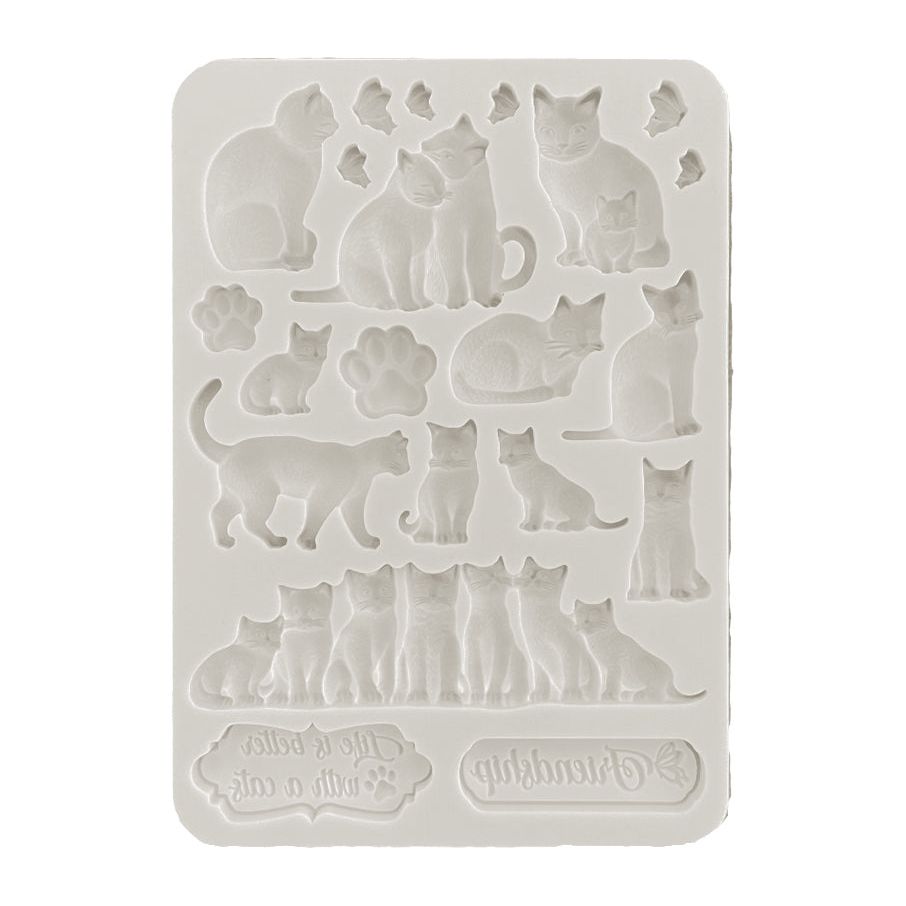 Orchids and Cats, beloved in many homes, embody elegance and adaptability, adding charm to our living. This collection, with its pastel colors, is versatile for any occasion. This versatile silicone mold is crafted to serve a wide range of creative purposes. With dimensions of approximately 5.83 x 8.27 inches and a thickness of 0.27 inches, it offers both convenience and ease of use. Whether you're working with resin or clay, this product provides a reliable and precise mold for your artistic projects. Stamperia Orchids And Cats Cats A5 Silicone Mold features 21 intricate designs, including various cat poses, butterflies, paw prints, a row of cats, and two labels with heartfelt messages like "Friendship" and "Life is better with a Cat."