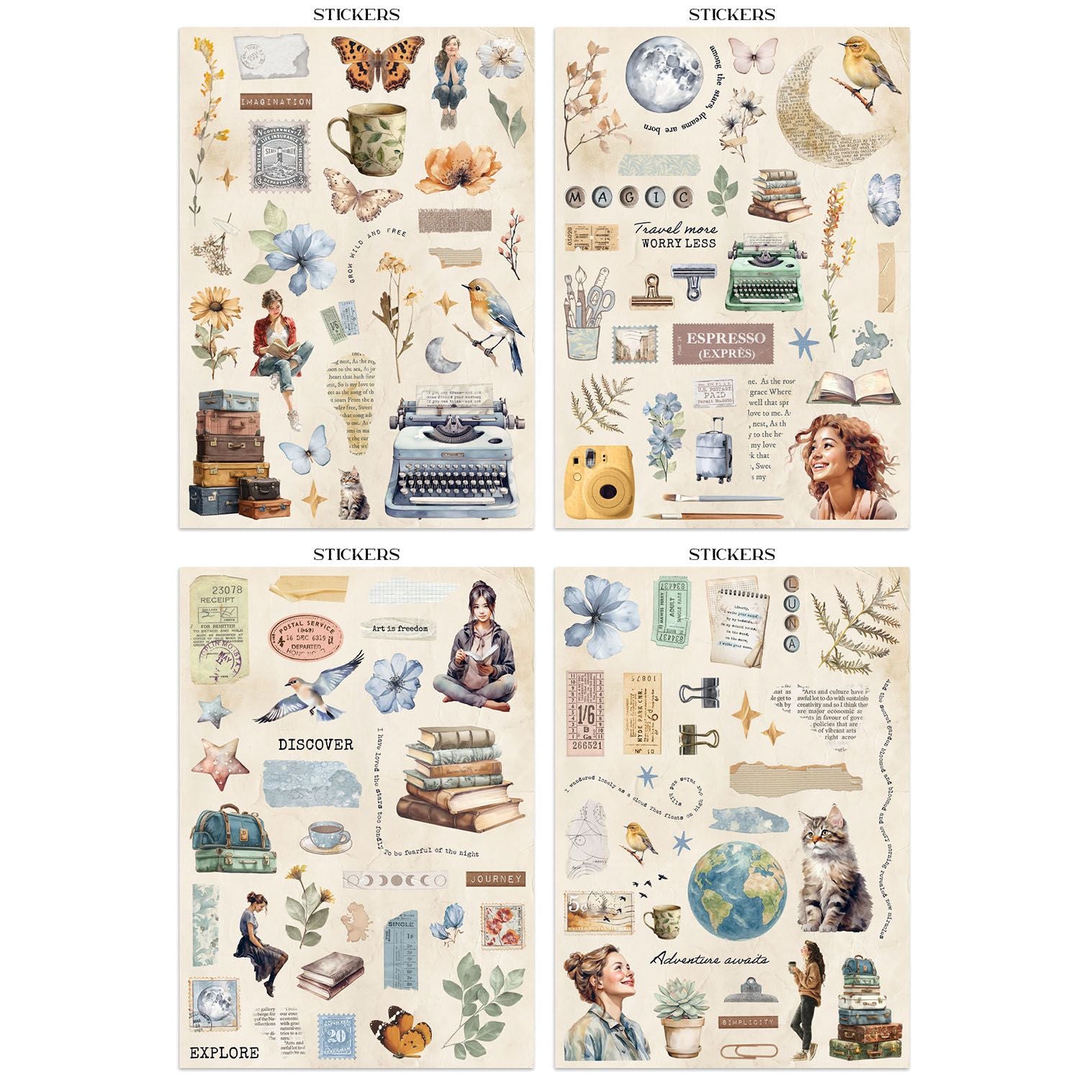 Stickers include girls, books, birds, stars, flowers, butterflies, luggage, typewriters, tickets, globes, foliage, textures, and sentiments such as "Art is freedom", "Discover", "I wandered lonely as a cloud that floats on high over vales and hills", "Espresso", "Imagination", and "Travel More, Worry Less".