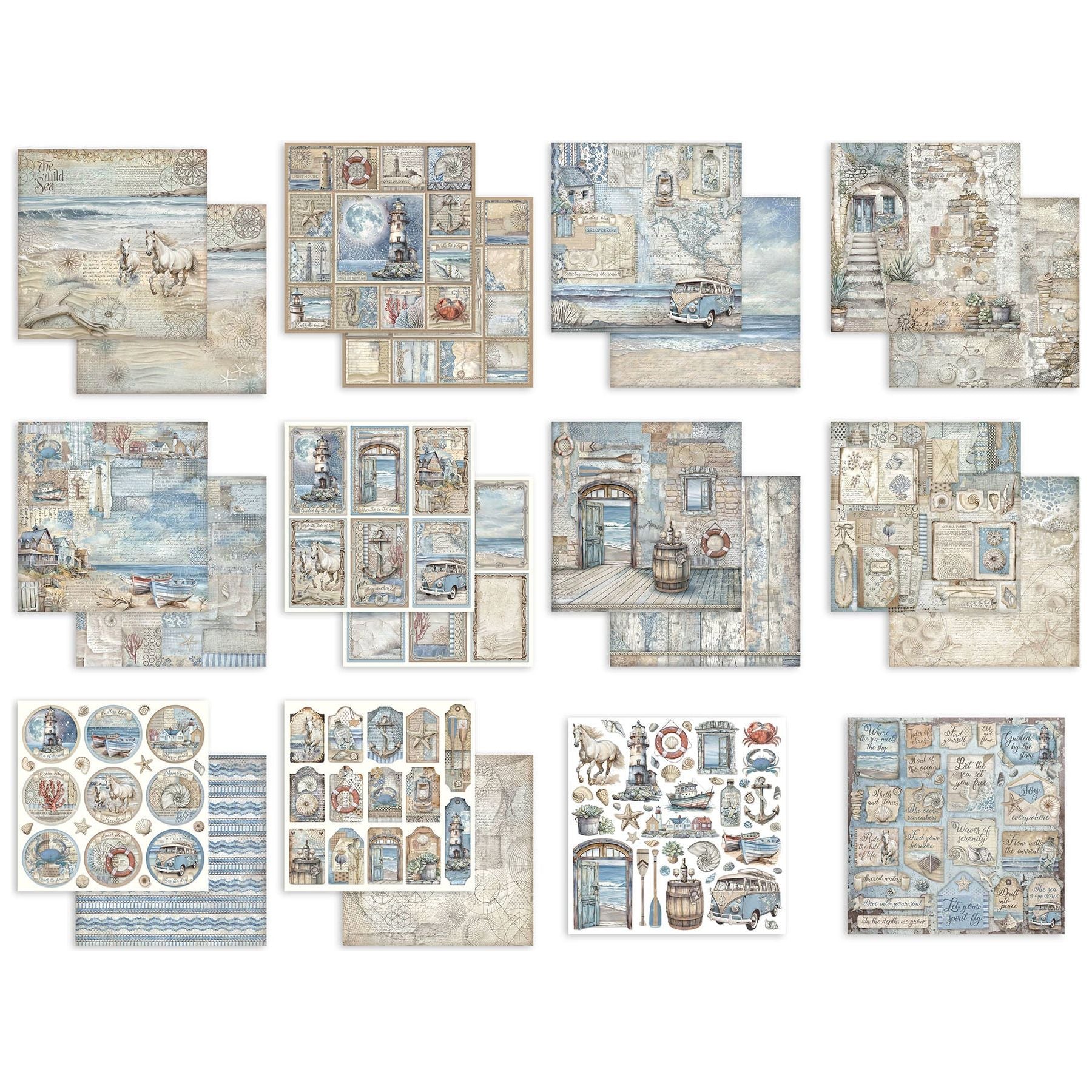 Silent Sea, designed by Cristina Radovan, captures the sea’s essence beyond the ordinary—its breeze, rhythmic waves, and the feeling of freedom it inspires. This paper pad includes ten double-sided sheets, each measuring 12 x 12 inches and made from high-quality cardstock weighing approximately 190 gsm. The designs incorporate beach scenes, horses, and nautical motifs including anchors, life preservers, oars, lighthouses, and shells. You'll also find Volkswagon buses, boats, notecards, borders, tags, ephemera, and evocative phrases like "Where the Sea Meets the Sky," "Tides of Change," "Let the Sea Set You Free," and "Guided by the Stars," among others.